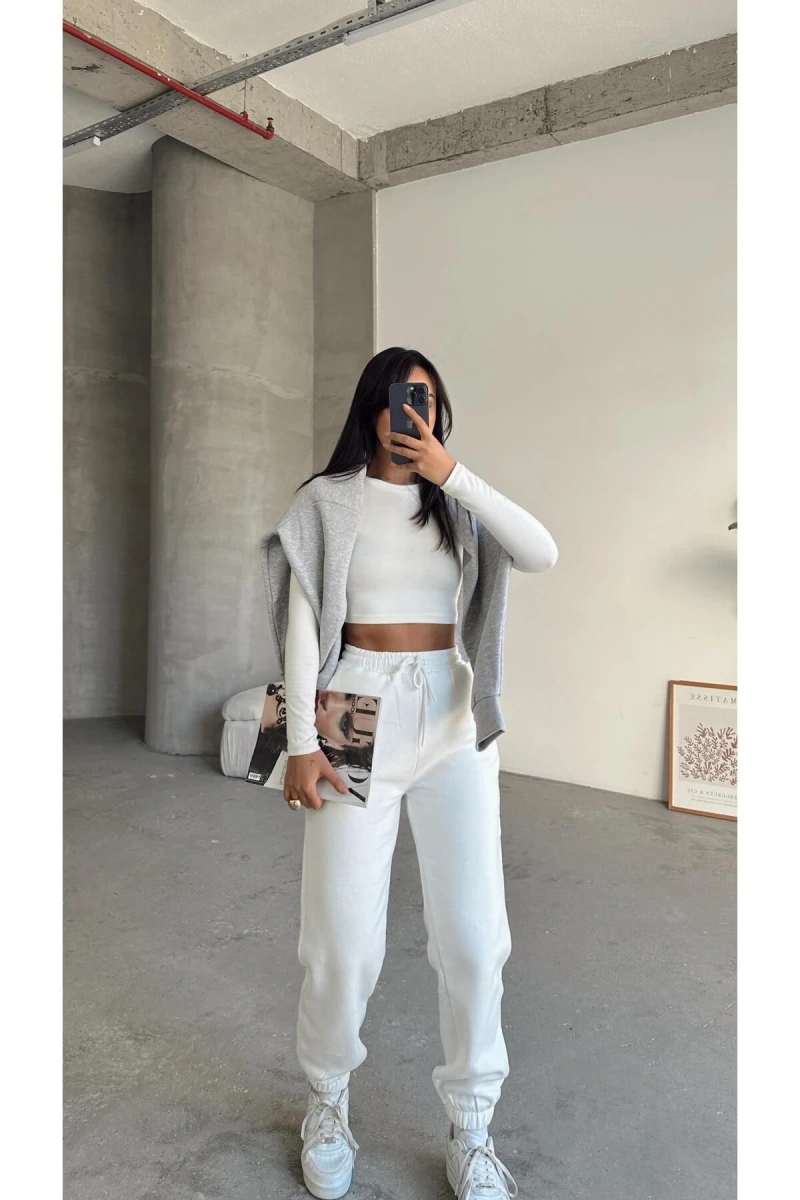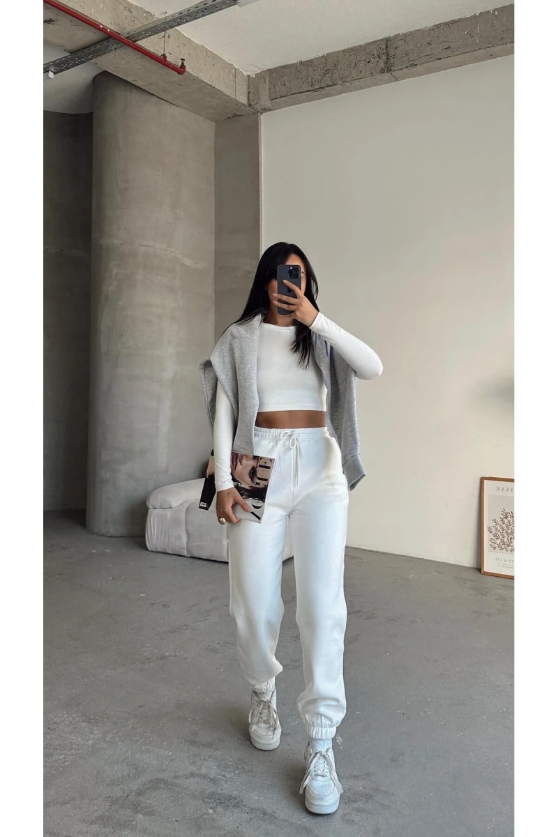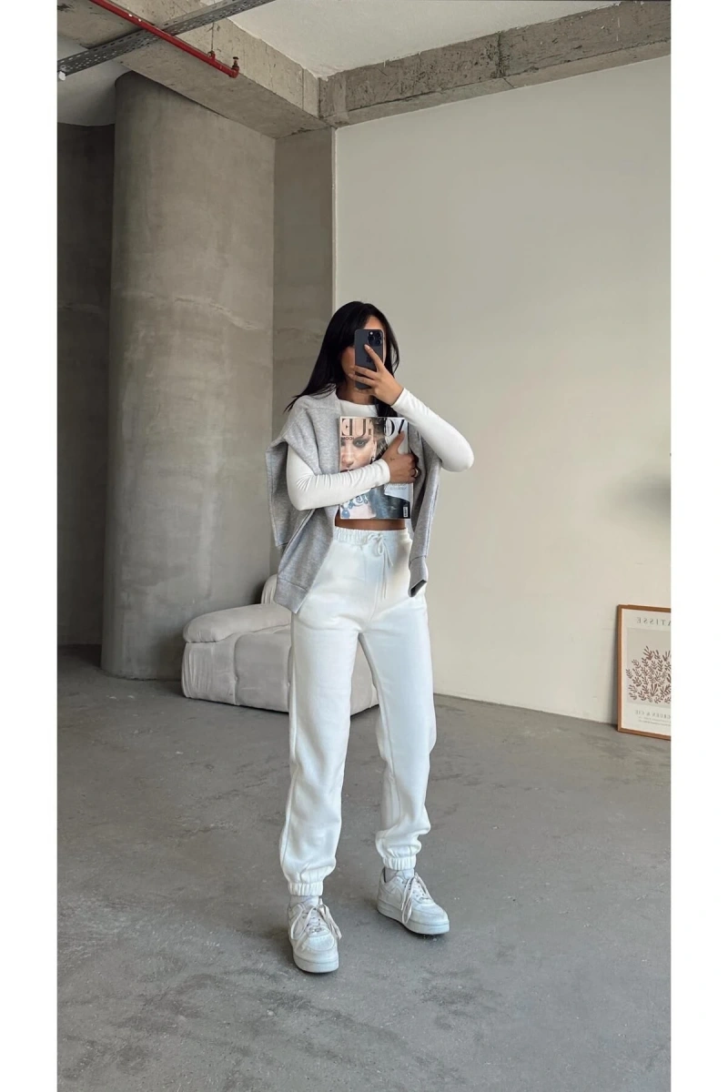 3 iplik şardonlu paça lastikli eşofman beyaz is001