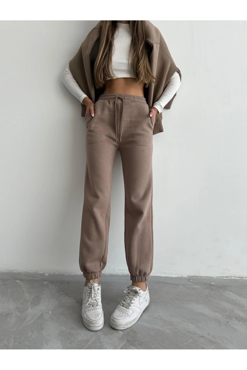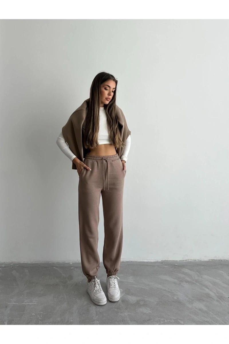 Kadınların rahatlığı ve şıklığı bir arada yaşayabileceği 3 iplik şardonlu paça lastikli eşofman vizon IS001, spor giyim tutkunlarının favorisi olmaya aday.