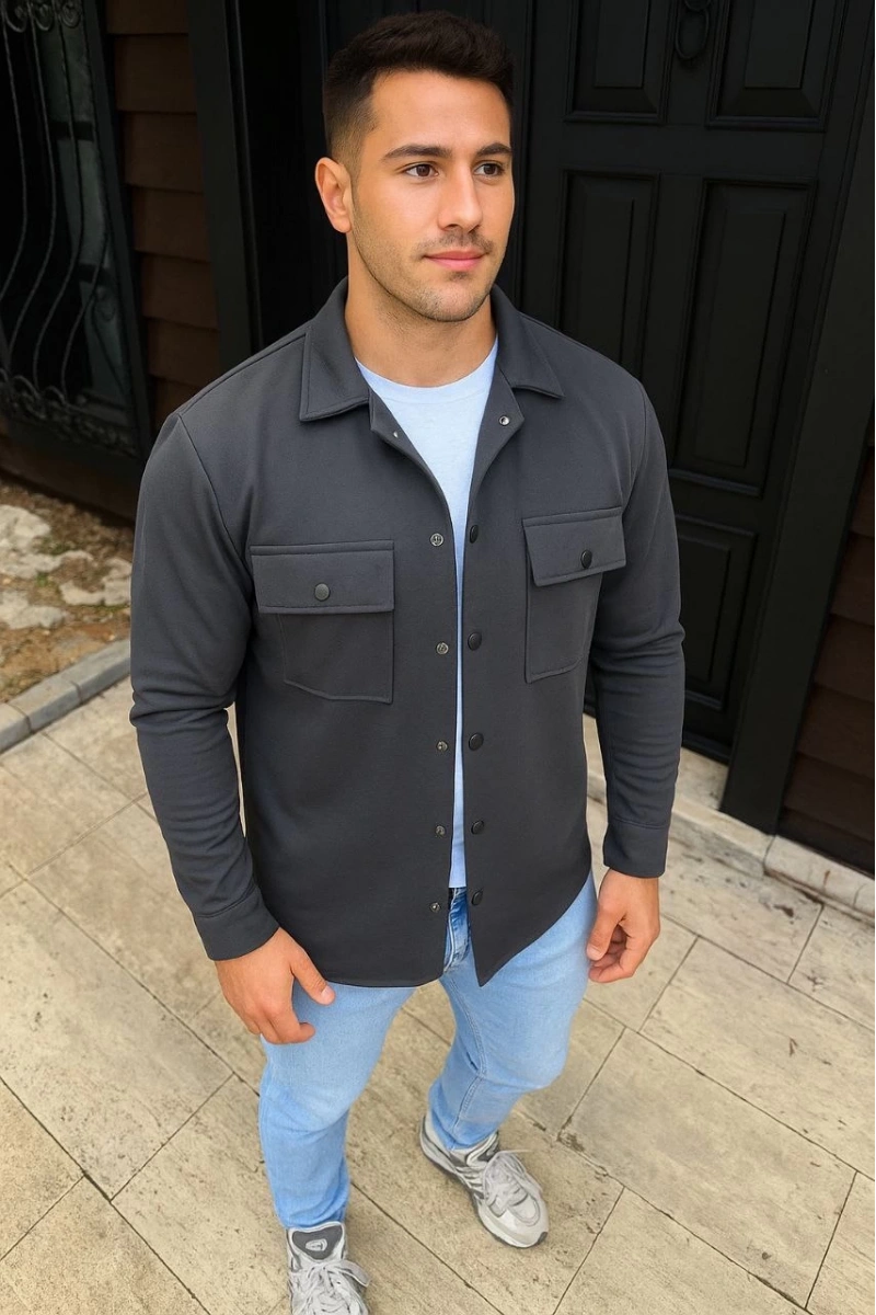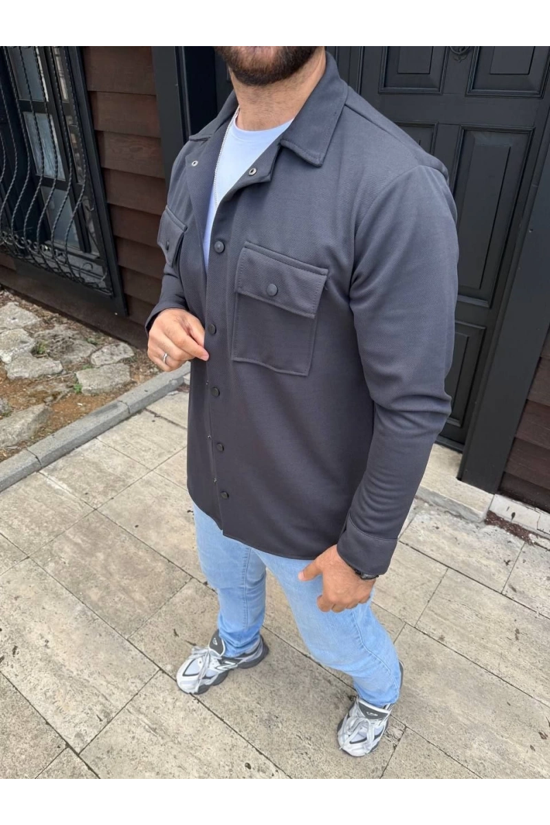 Erkek Diagonal Kumaş Cepli Çıtçıtlı uzun Kollu, Gömlek Oversize Rahat Kalıp Günlük Şık Stil - Füme