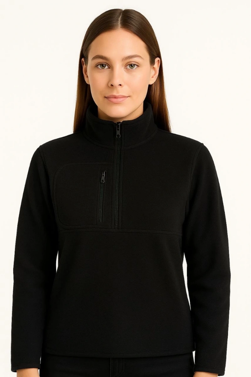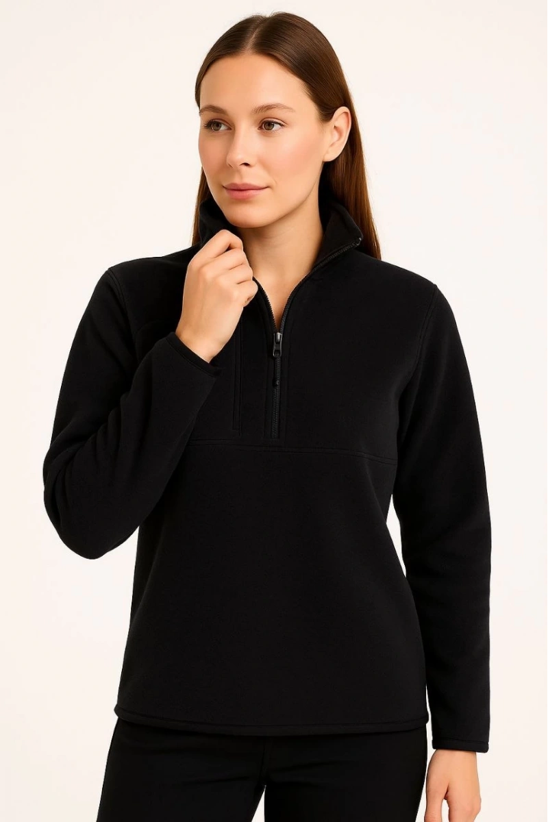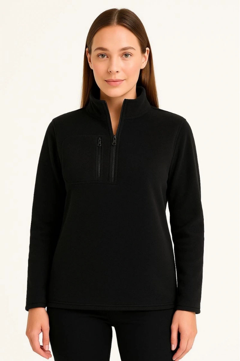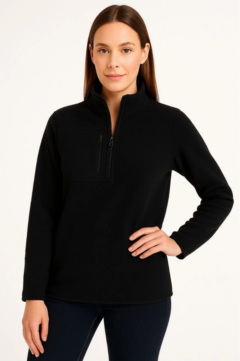 Kadın Polar Kazak – Dik Yaka, Yarım Fermuarlı, Fermuarlı Göğüs Cepli, Siyah Biyeli, Kışlık Rahat Regular Fit Günlük Model - Siyah