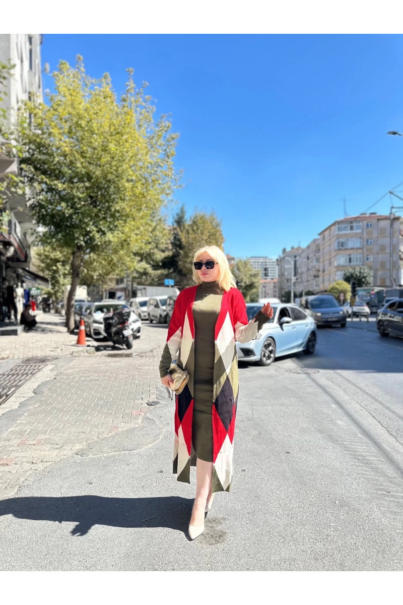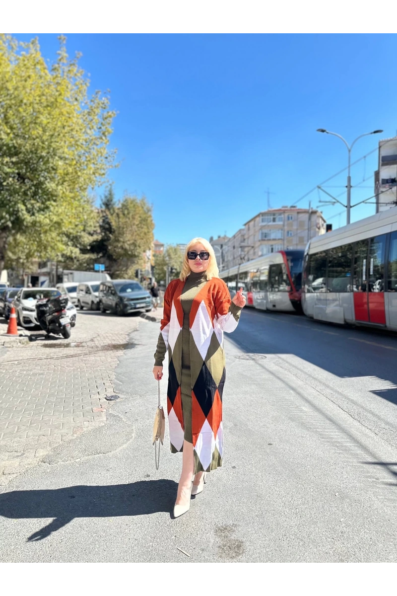 Uzun hırka içi elbise ikili triko takım ekose baklava desen haki kırmızı