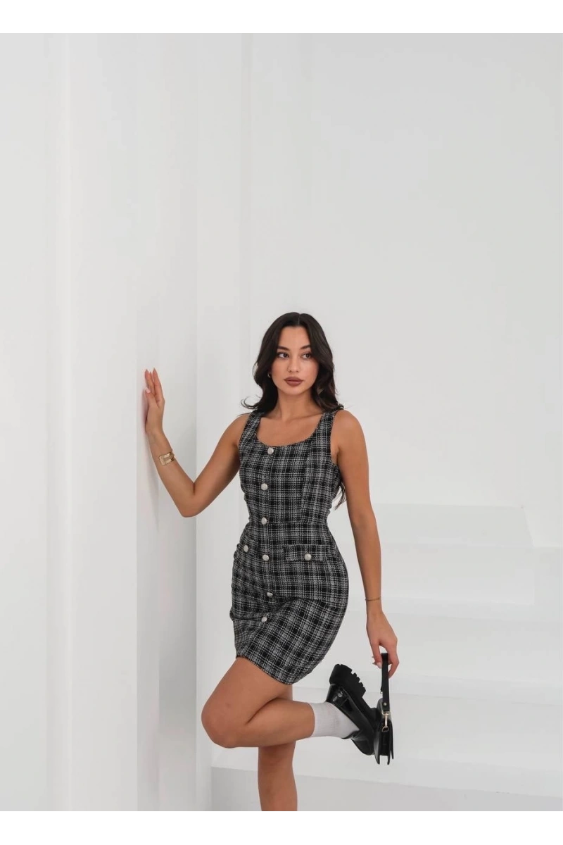 Askılı ch kumaş düğmeli elbise siyahbeyaz h265007