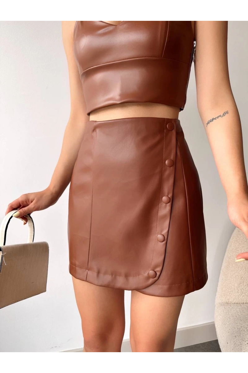Günlük kullanımdan özel davetlere kadar birçok farklı kombinle rahatlıkla tamamlanabilen Beş düğmeli oval deri eteği, topuklu ayakkabılarla veya sneaker'larla kombinleyerek farklı tarzlara kolayca adapte edebilirsiniz.