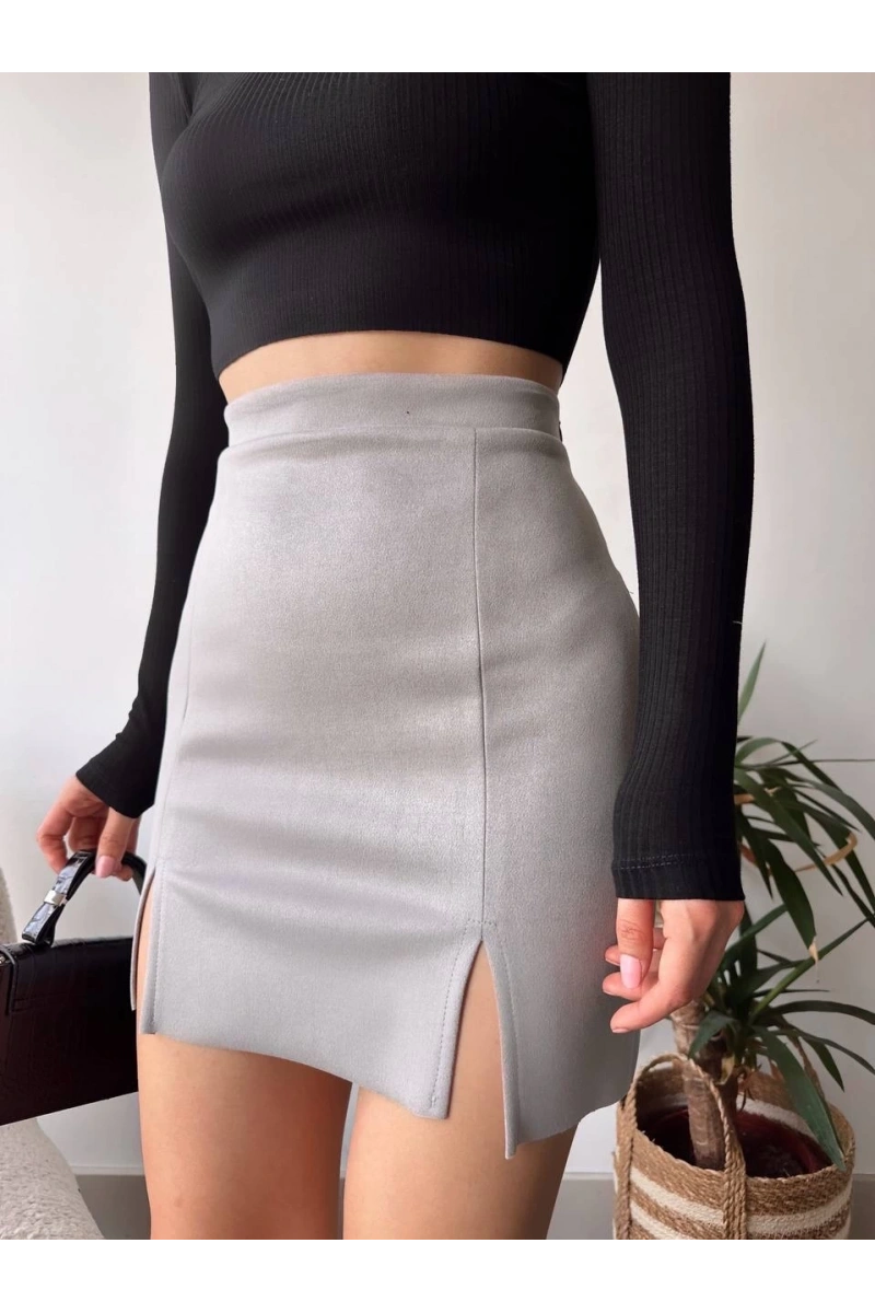 Şık ve şıklığıyla ön plana çıkan Çift yurtmaçlı süet etek gri s241002, gardırobunuzun vazgeçilmezi olmaya aday!