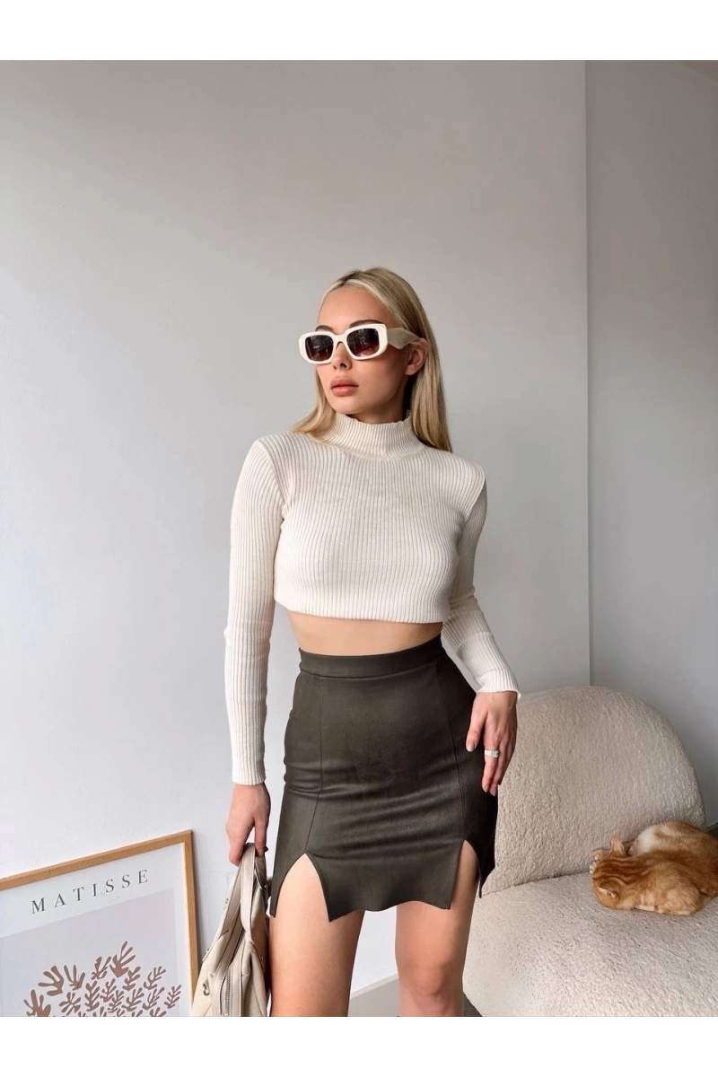 Çift yurtmaçlı süet etek haki S241002, şıklığı ve rahatlığı bir arada arayan kadınların tercihi olacak. Siz de gardırobunuza ekleyerek şıklığınızı tamamlayabilirsiniz!