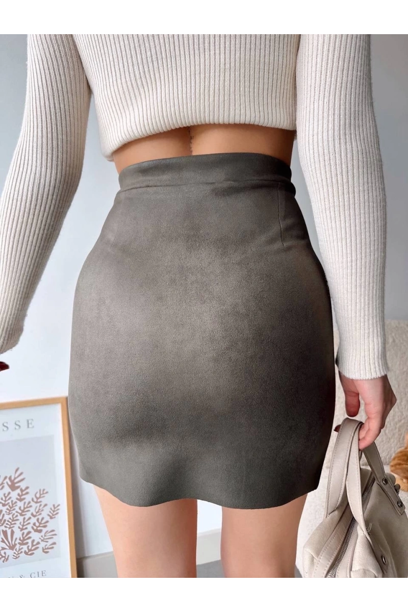 Şık ve tarz bir görünüm elde etmenin olmazsa olmazı çift yurtmaçlı süet etek haki S241002, gardırobunuzun vazgeçilmezi olmaya aday!