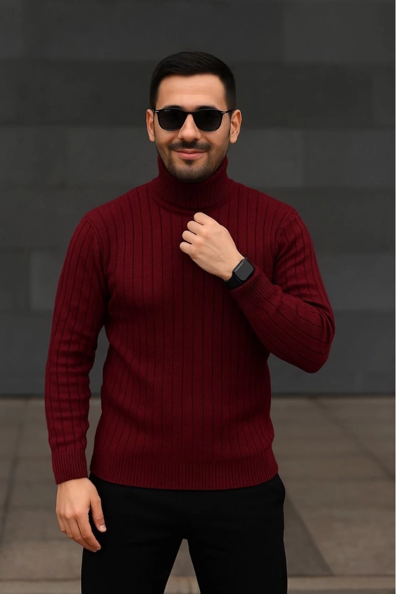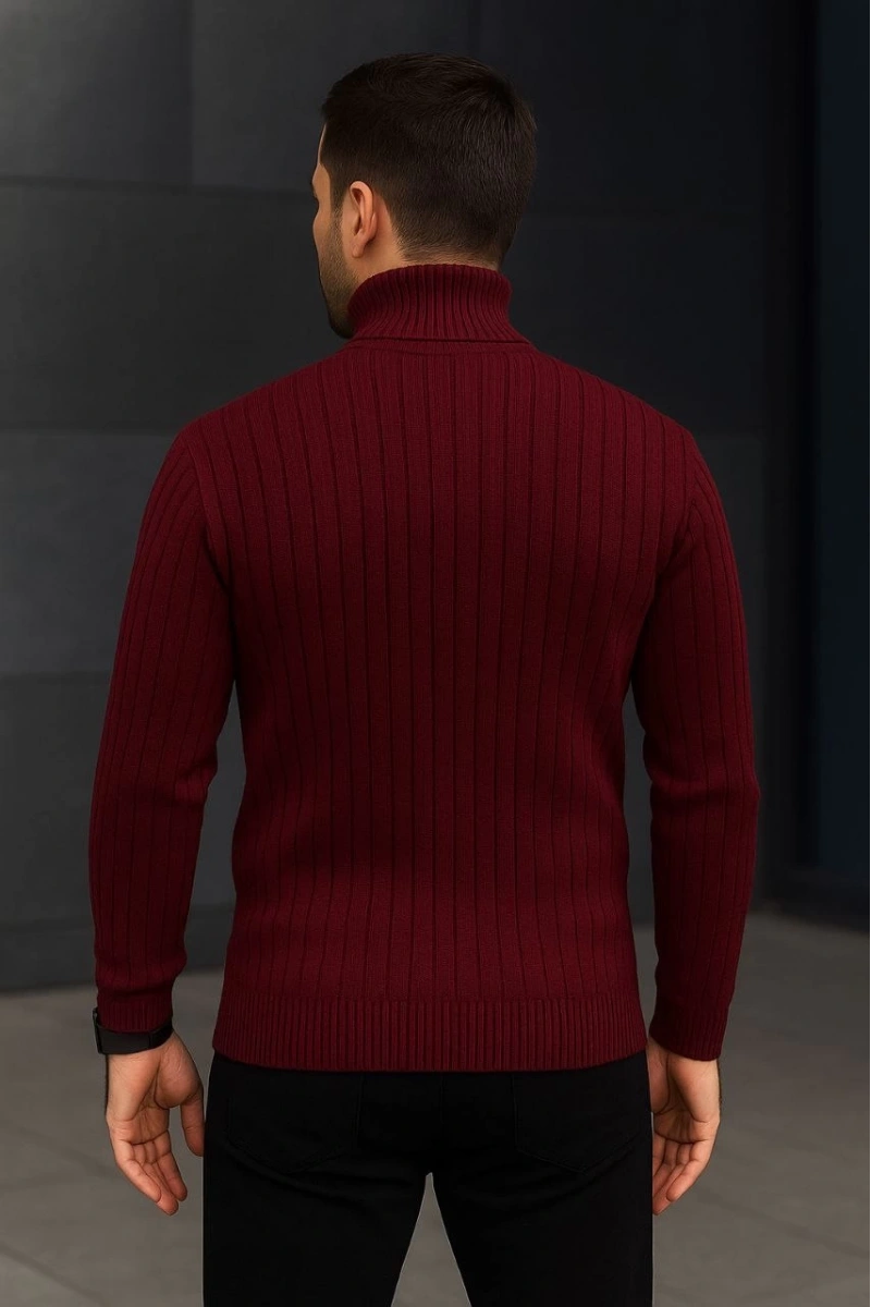 Erkek Balıkcı Yaka Bağazlı Triko Kazak Pamuklu Kalın Fitilli Dokuma, Regular Fit Uzun Kollu Kışlık Model - Bordo
