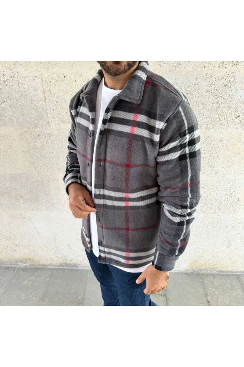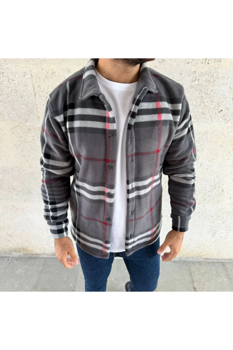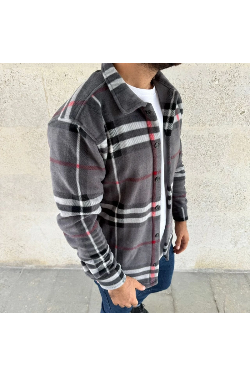 Erkek Ekose Desenli Düğmeli Polar Yakalı Uzun Kollu Gömlek Oversize Rahat Kalıp - Füme
