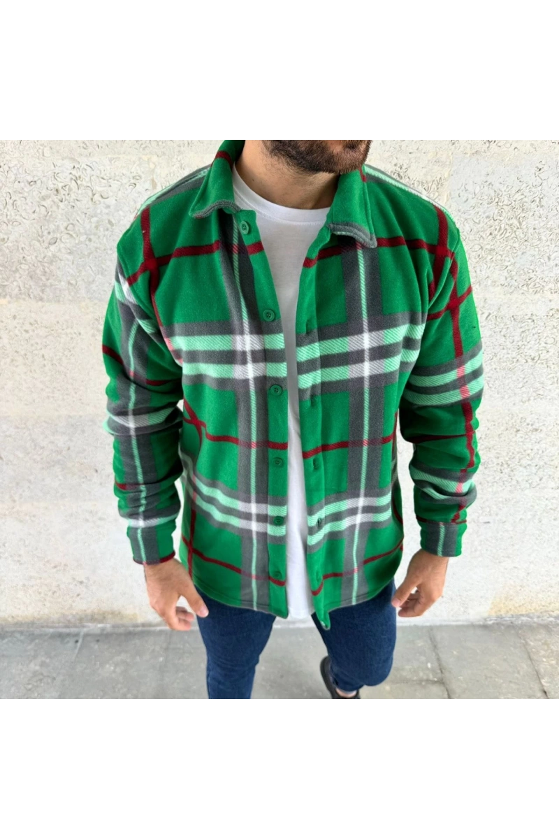 Erkek Ekose Desenli Düğmeli Polar Yakalı Uzun Kollu Gömlek Oversize Rahat Kalıp - Yeşil