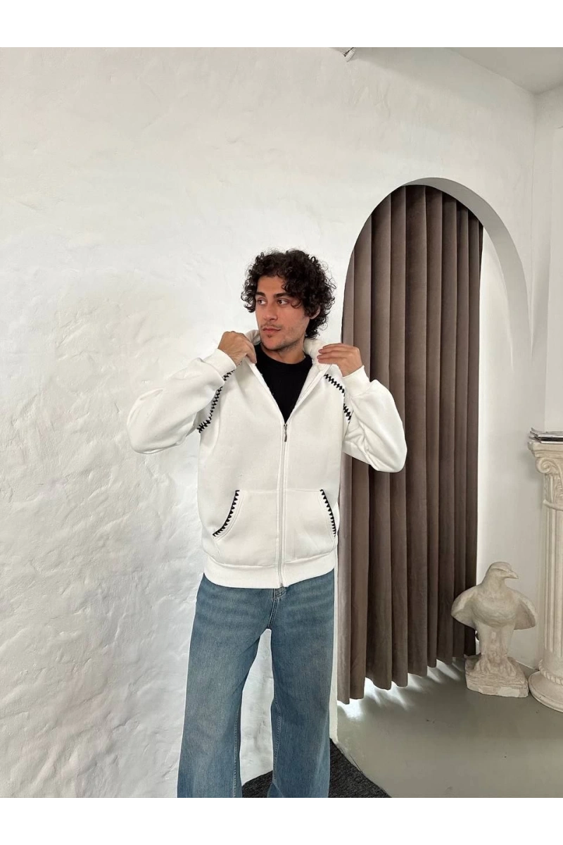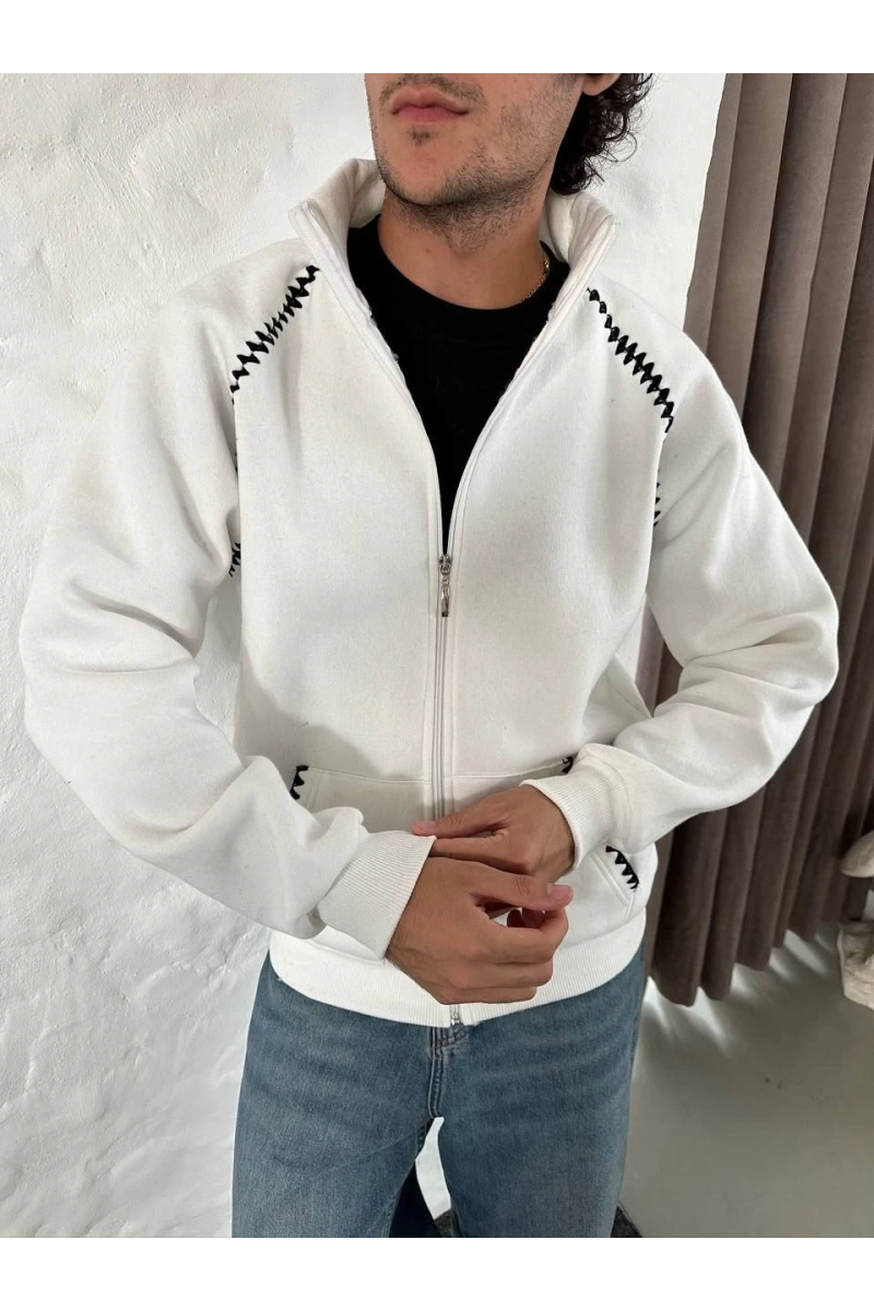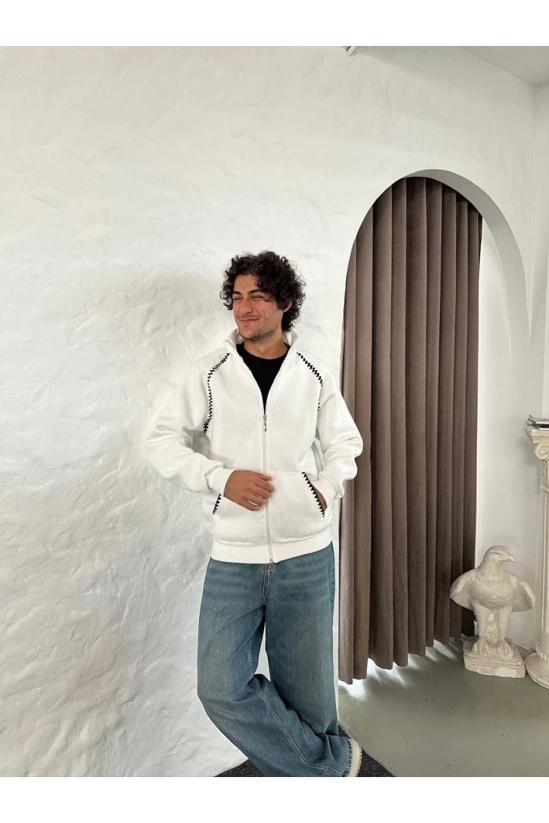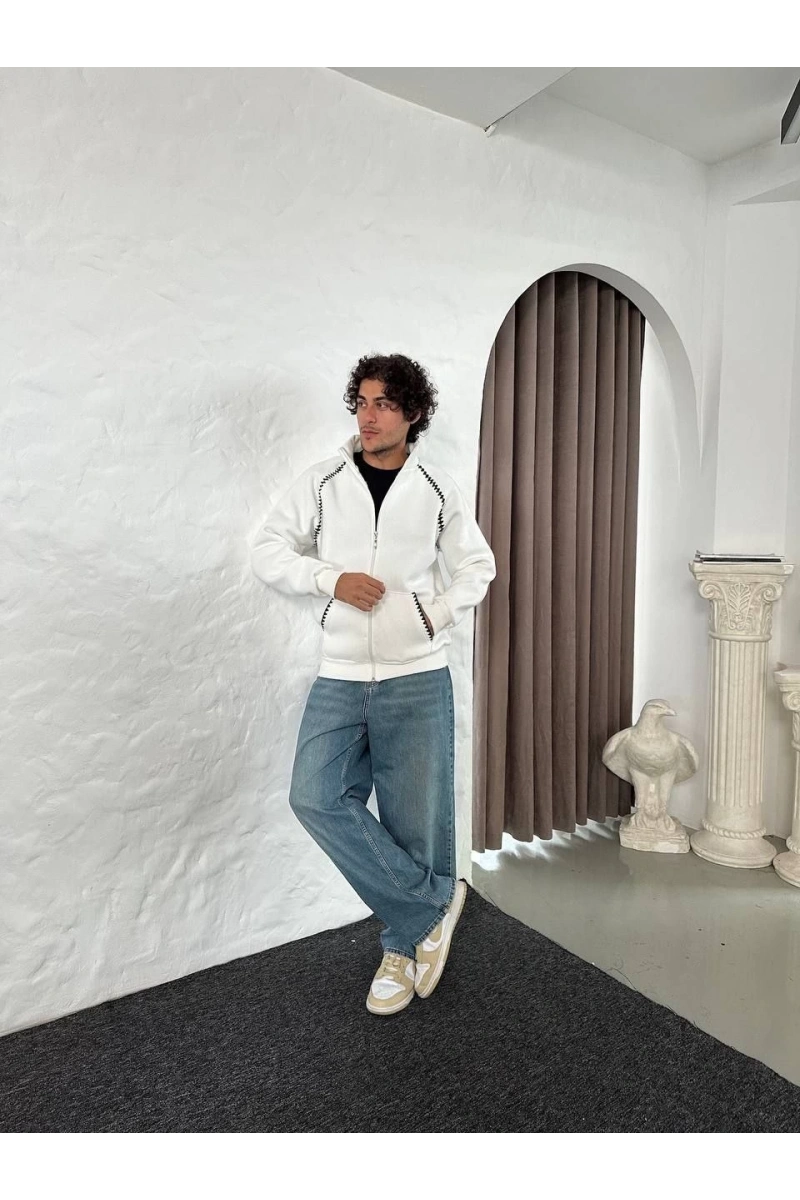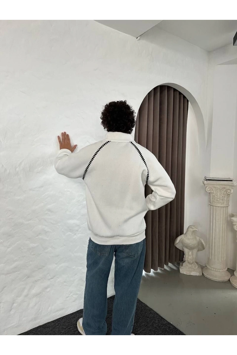Erkek Oversize Dik Yaka Fermuarlı Sweatshirt - Zincir Nakışli Kanguru Cepli - Beyaz