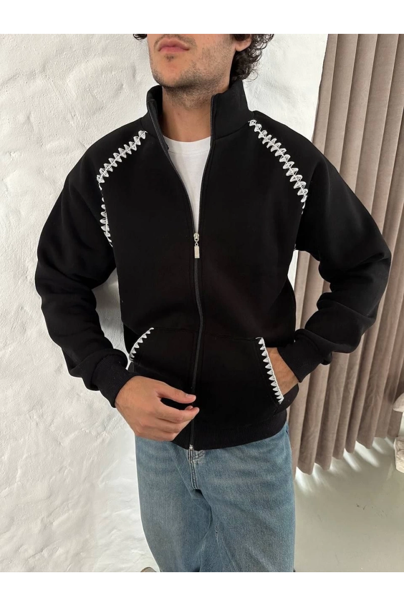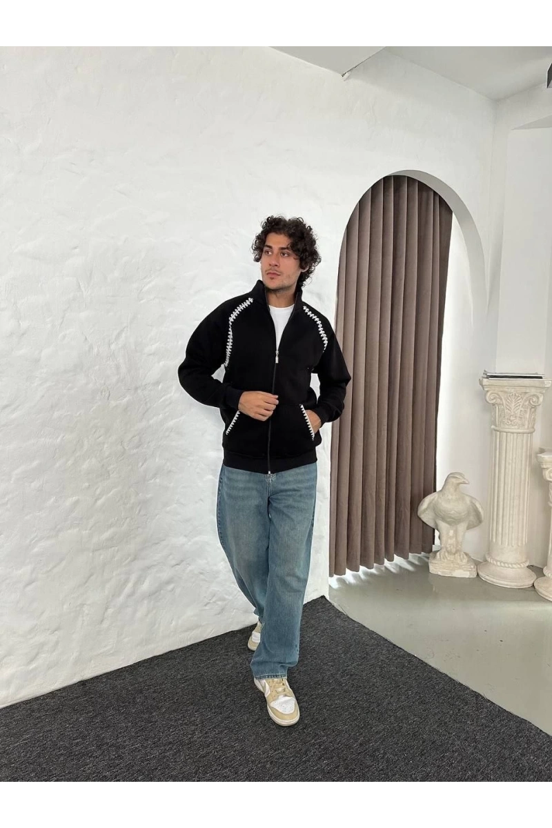 Erkek Oversize Dik Yaka Fermuarlı Sweatshirt - Zincir Nakışli Kanguru Cepli - Siyah