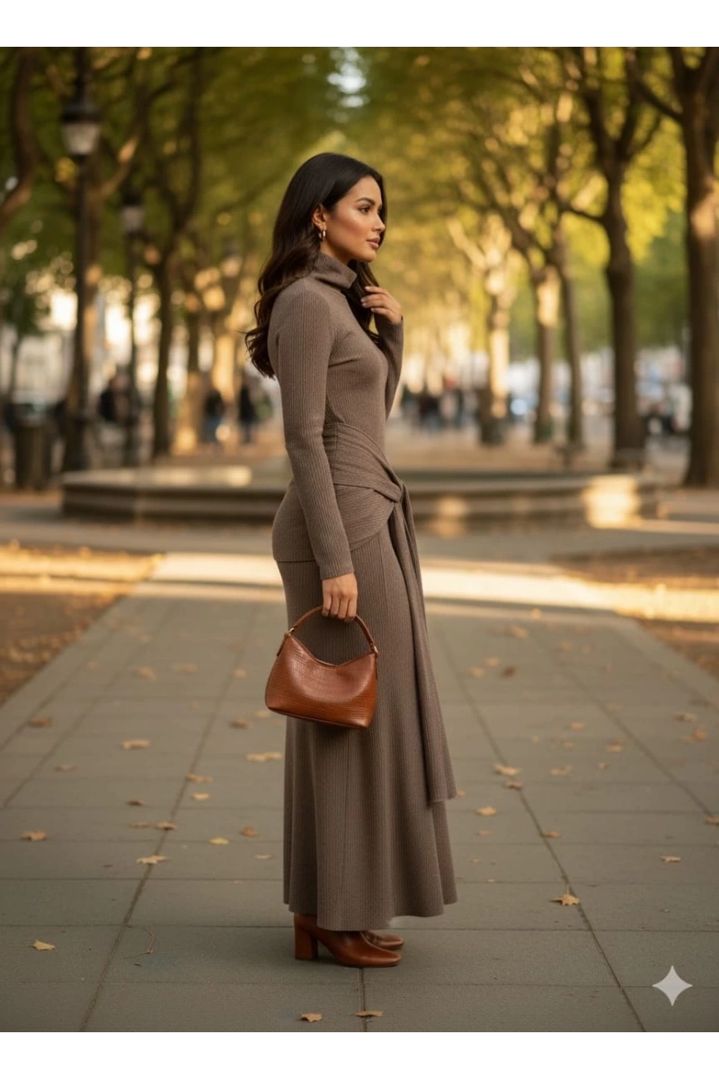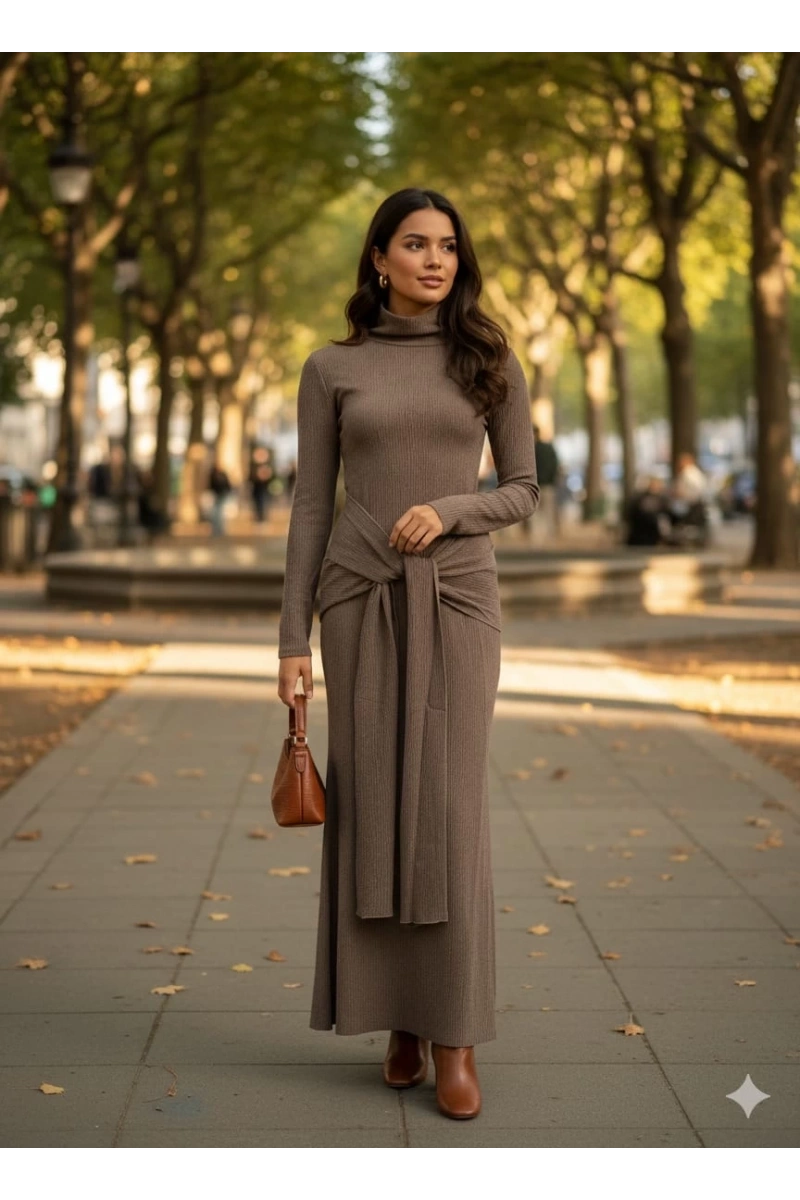 Bu vizon renkli uzun elbise, şıklığı ve rahatlığı bir arada sunuyor. Kendinden kemer detayı sayesinde belinizi ön plana çıkarırken, salaş kesimiyle de hareket özgürlüğü sağlar. İster günlük kullanım için ister özel davetlerde tercih edin, her ortama uyum sağlayacak şık bir seçenektir.