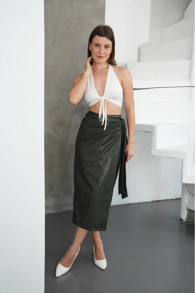 Şıklık ve rahatlığı bir arada sunan Kuşaklı Uzun Deri Etek Haki, gardırobunuzun vazgeçilmez parçalarından biri olmaya aday.