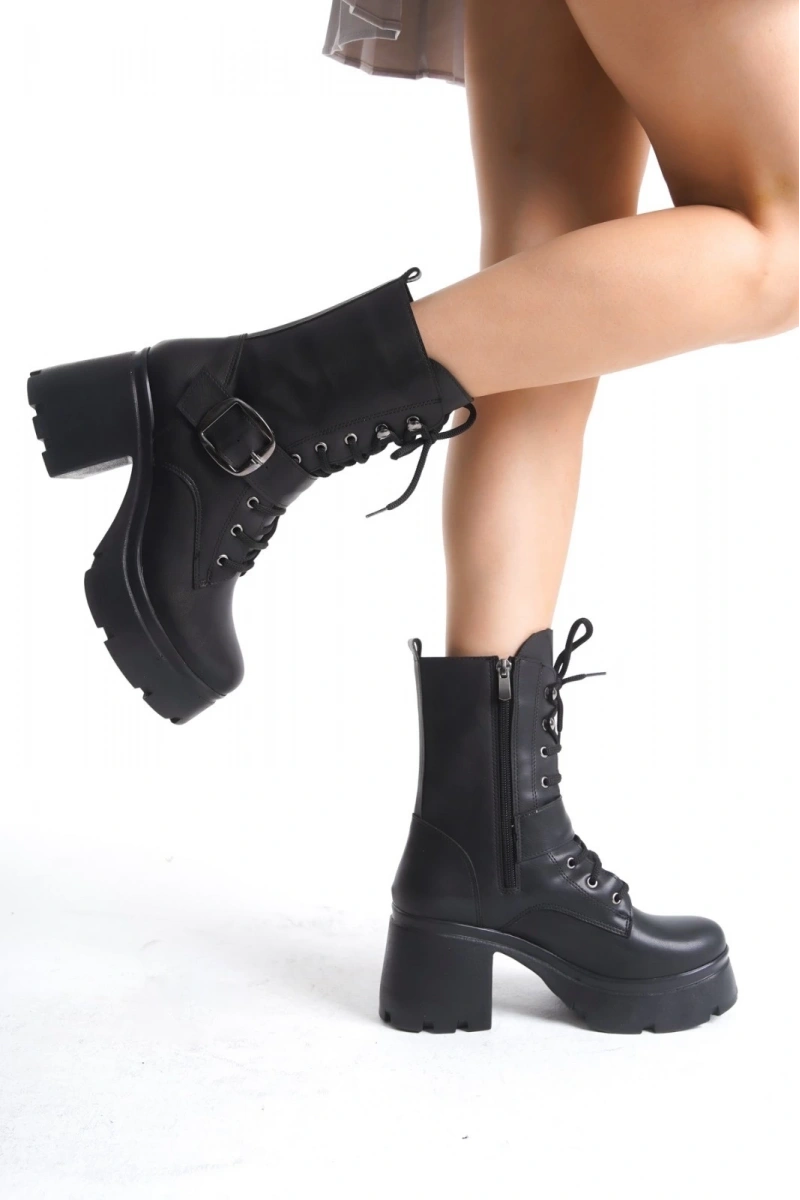 Linma Siyah Cilt Bağcıklı Topuklu Bot