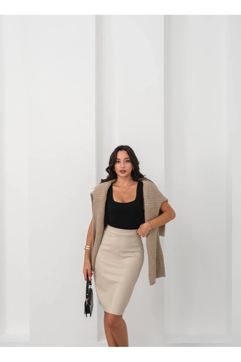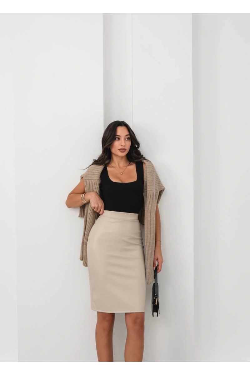 Arkadan yırtmaçlı kalem etek bej, şıklığı ve zarafeti bir arada sunar. Hem günlük kullanıma uygun hem de özel davetlerde tercih edilebilecek bir parçadır.