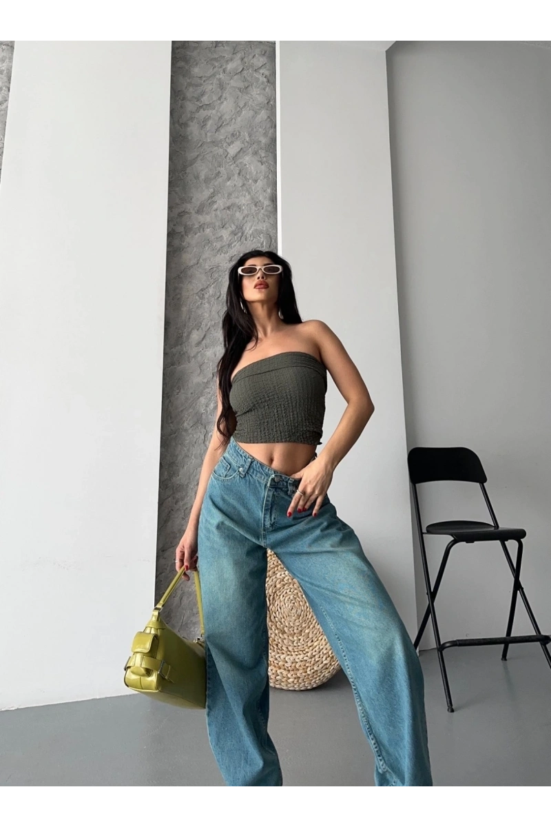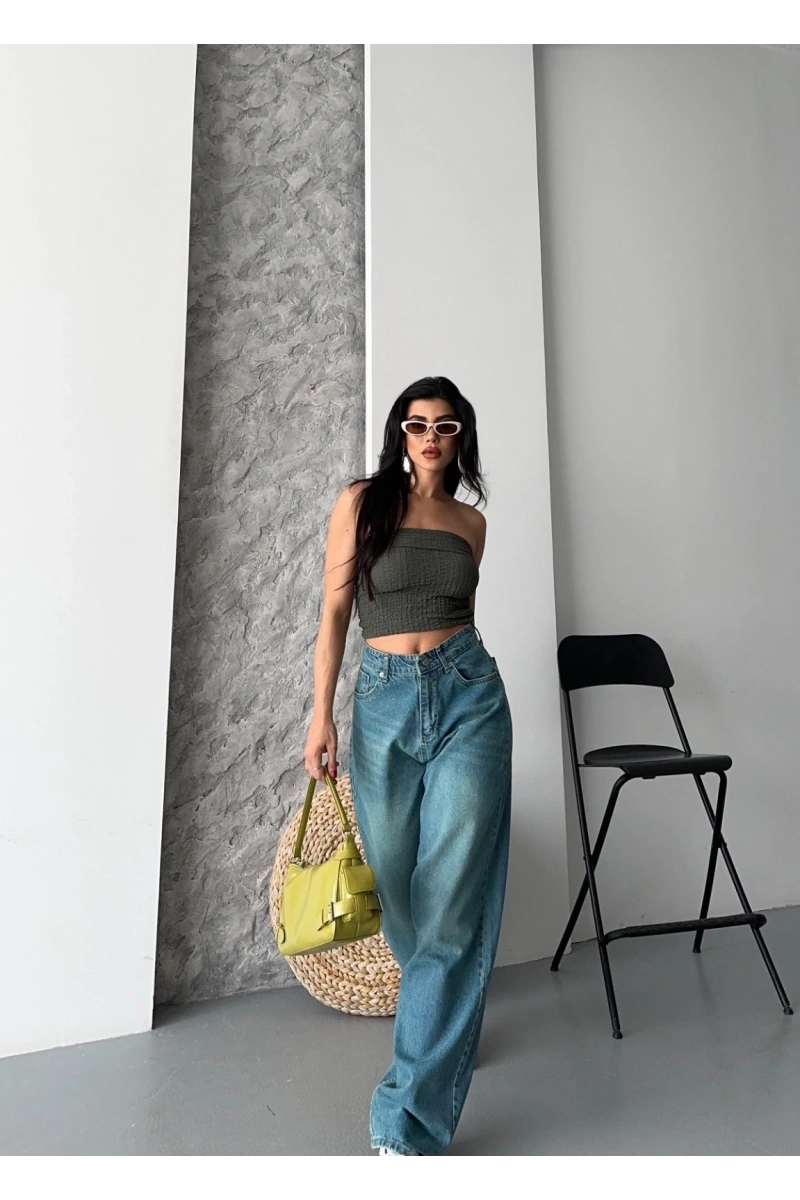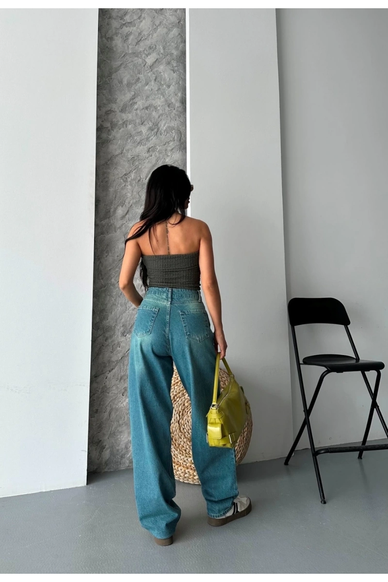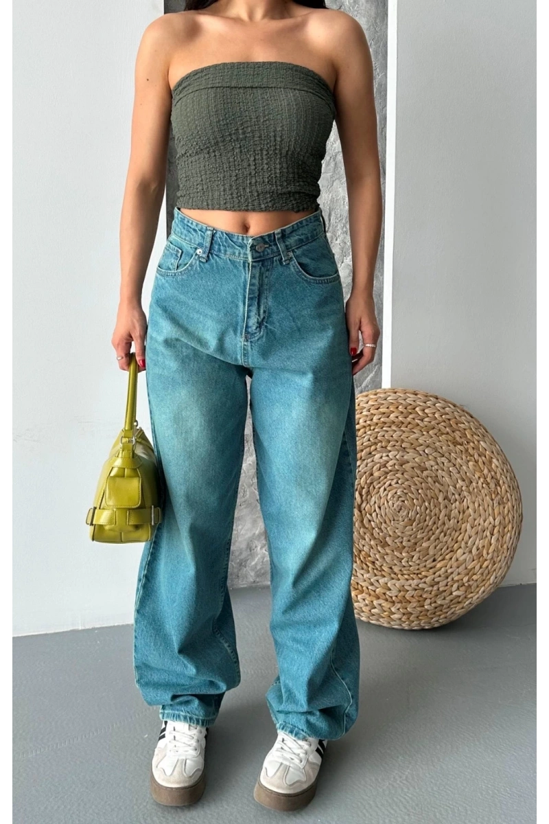 Kadınlar için şıklığı ve rahatlığı bir arada sunan Baggy taş enzim bıyık yıkama jeans pantolon yeşil tint d2007, gardırobunuzun vazgeçilmezi olmaya aday.