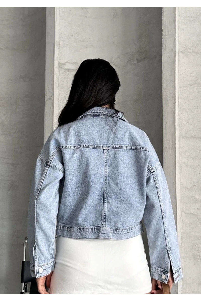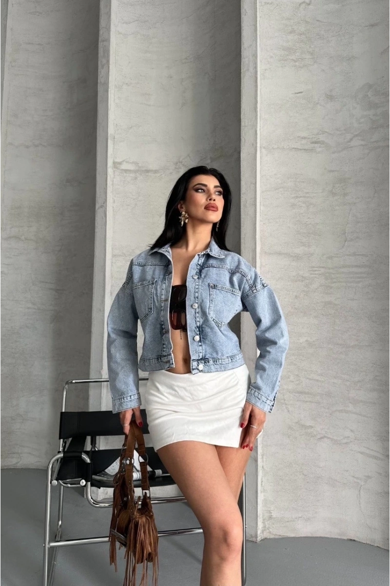 Modern tasarımıyla öne çıkan Çift Cepli Kol Katlamalı Kar Yıkama Crop Kot Ceket Buz Mavi D2000, gardırobunuzun vazgeçilmez parçalarından biri olmaya aday.