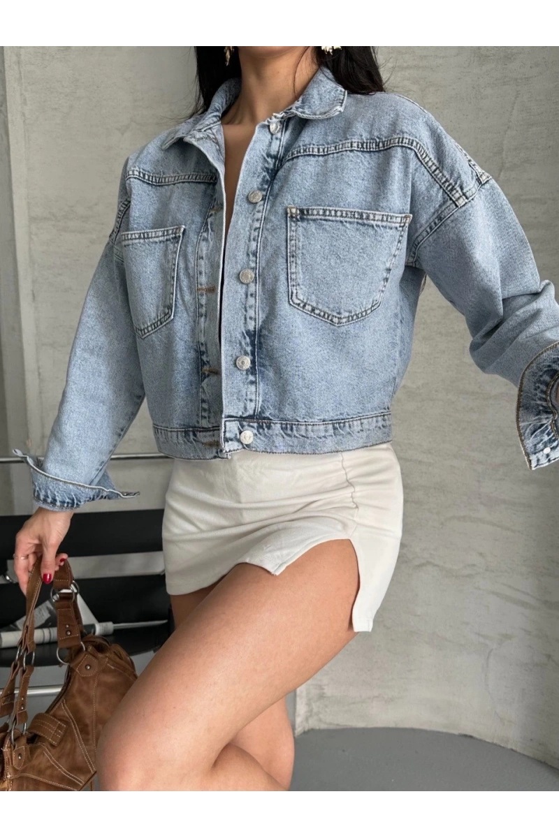 Çift cepli kol katlamalı kar yıkama crop kot ceket buz mavi d2000