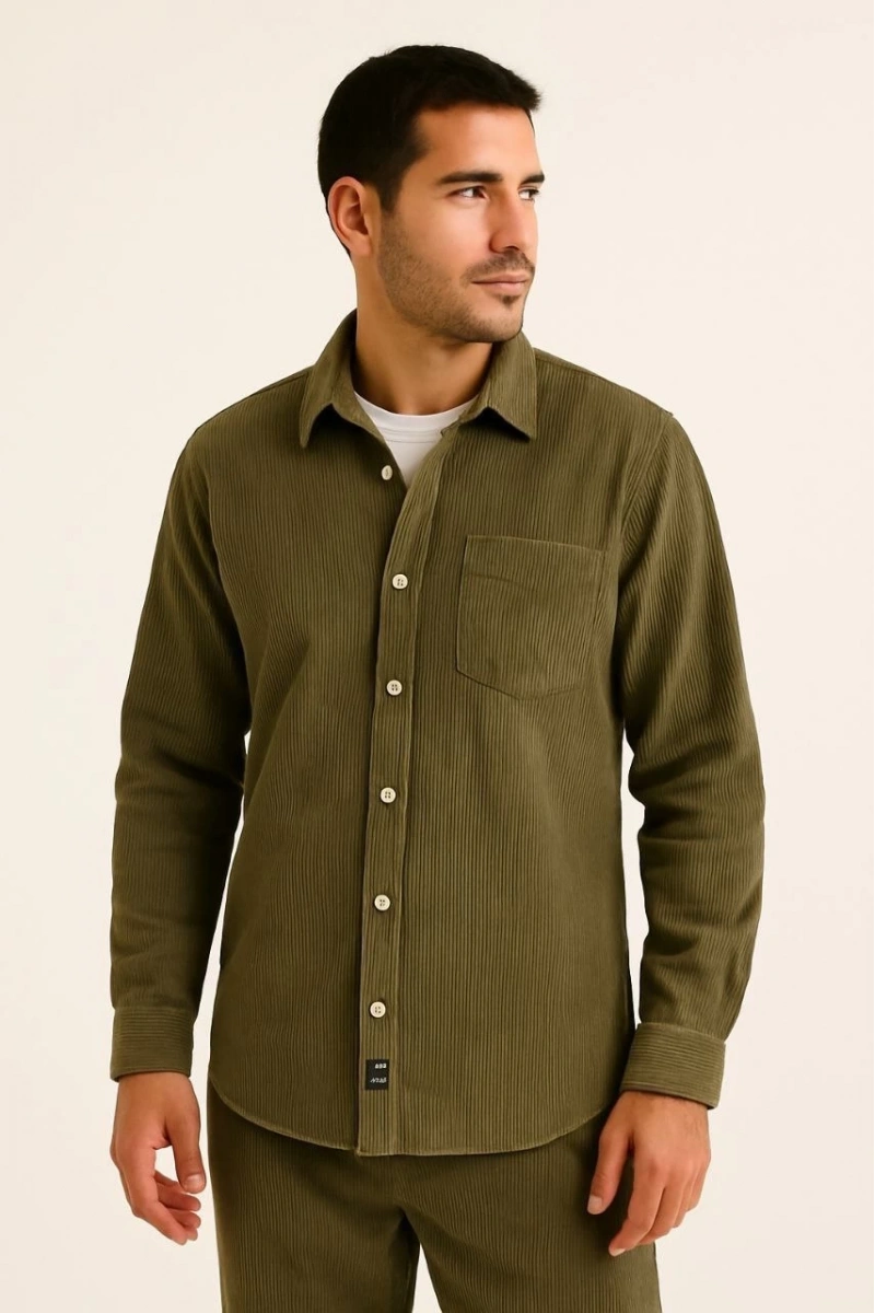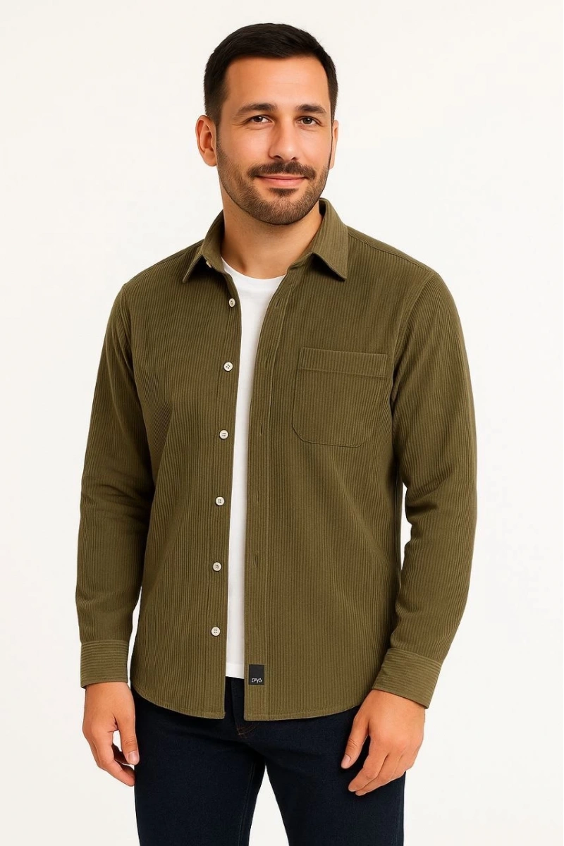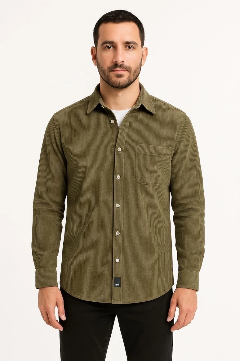 Erkek Fitilli Kadife Cepli Gömlek Oversize Rahat Kalıp - Haki