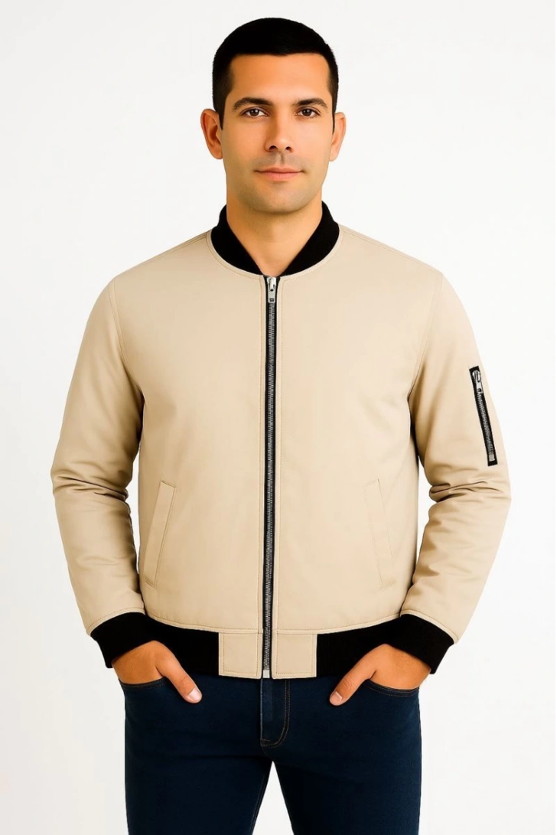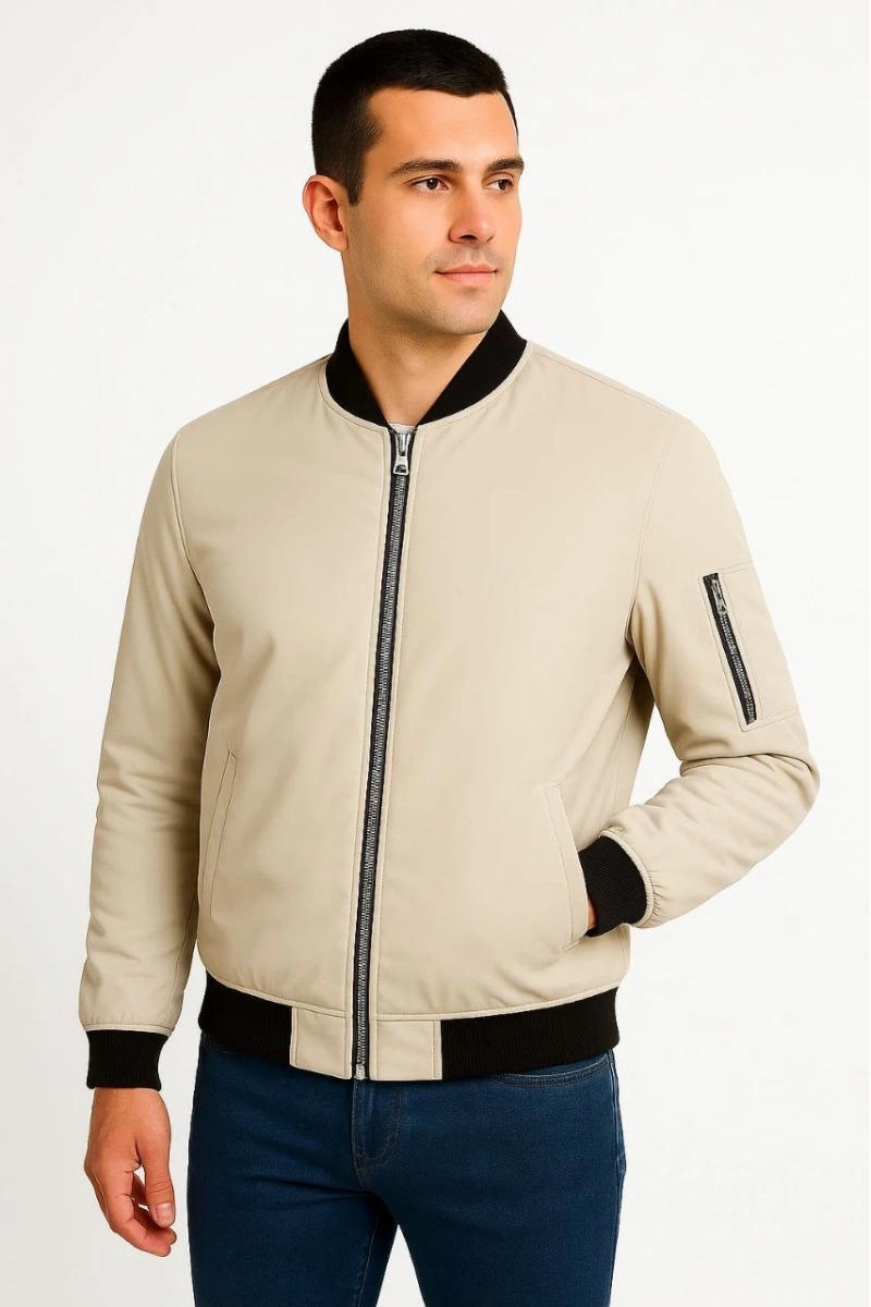 Erkek Bomber Mont Ceket – Fermuarlı, Kapitone İçi Astarlı, Su İtici Kumaş, Regular Fit, Uzun Kollu, Yandan Cepli, Bahar & Kış Rahat Günlük Stil - Bej