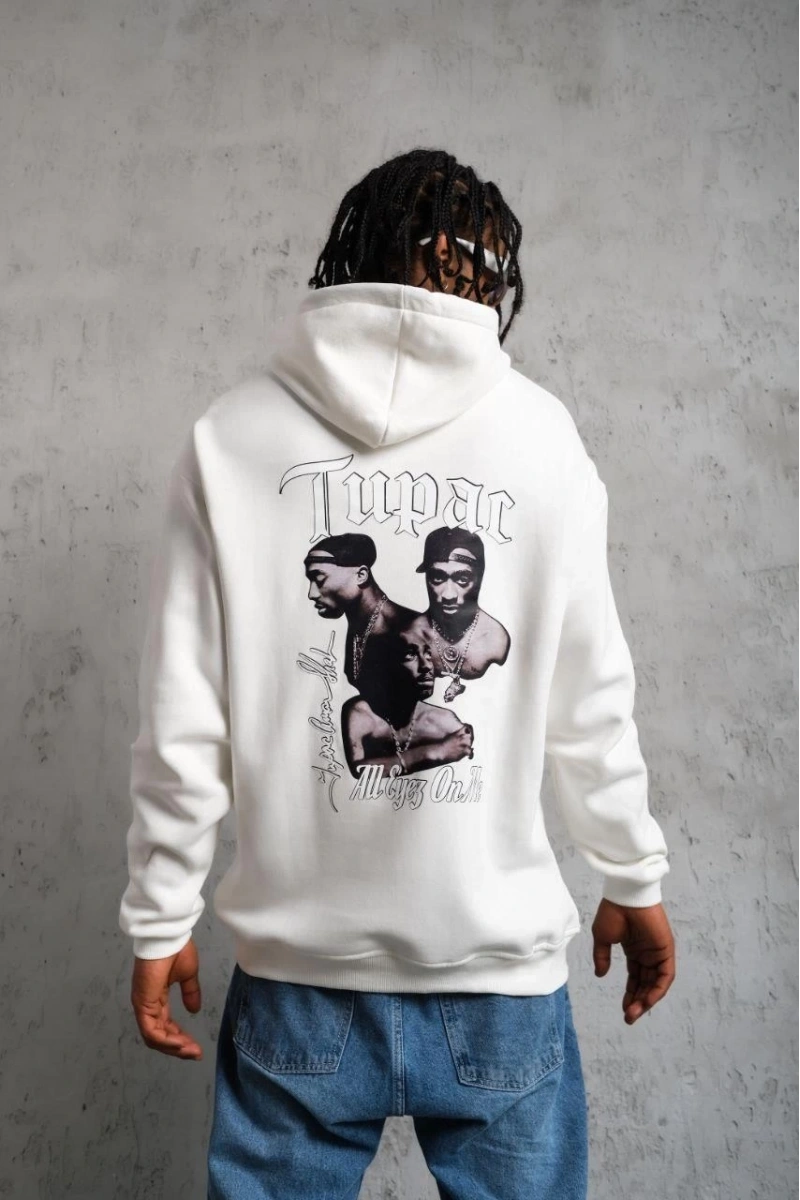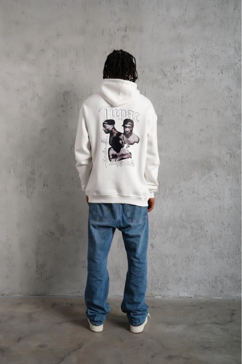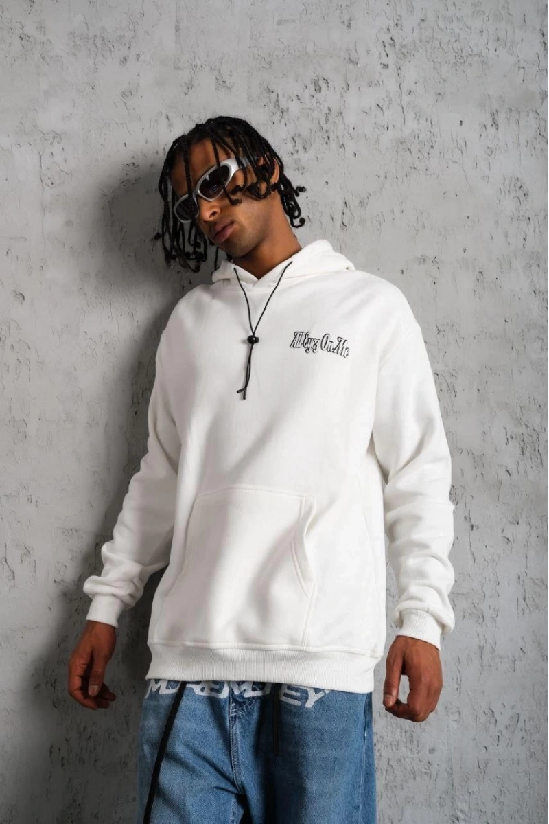 Erkek Oversize Üç İplik Kapüşonlu Sweat – Kol ve Etek Ribana Detaylı, Ön ve Sırt Baskılı, Kanguru Cepli Rahat Kalıp Model - Beyaz