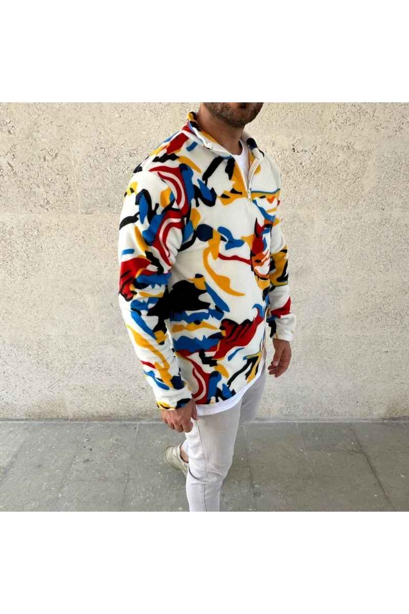 Erkek Yarım Fermuarlı Desenli Polar Sweat – Renkli Abstract Desen Yakalı, Uzun Kollu, Oversize Rahat Kalıp, - Beyaz
