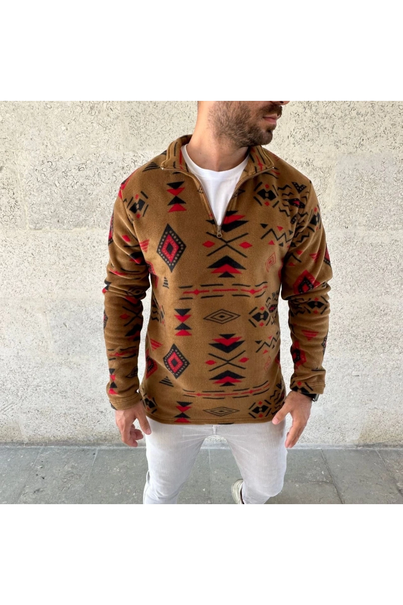 Erkek Yarım Fermuarlı Desenli Polar Sweat Tribal Etnik Desen Yakalı, Uzun Kollu, Oversize Rahat Kalıp, - Kahverengi