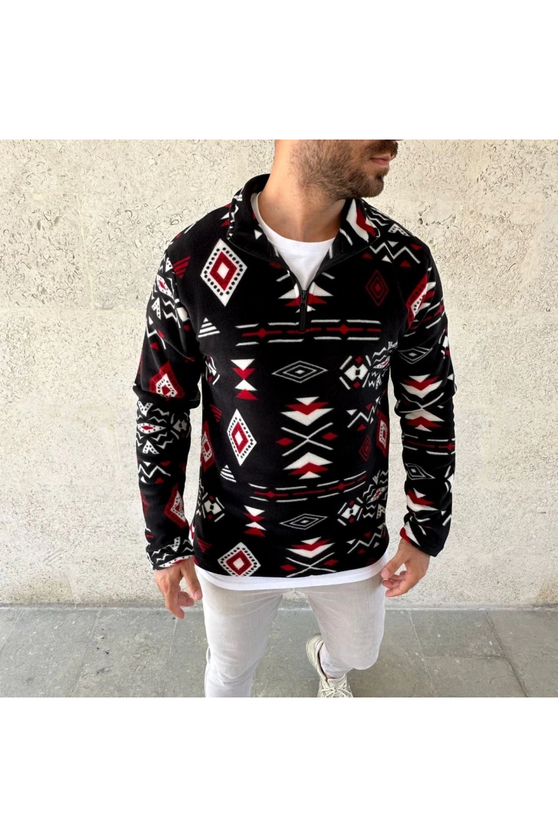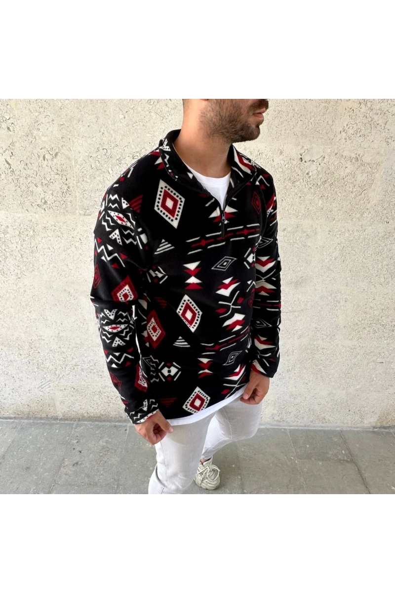 Erkek Yarım Fermuarlı Desenli Polar Sweat Tribal Etnik Desen Yakalı, Uzun Kollu, Oversize Rahat Kalıp, - Siyah