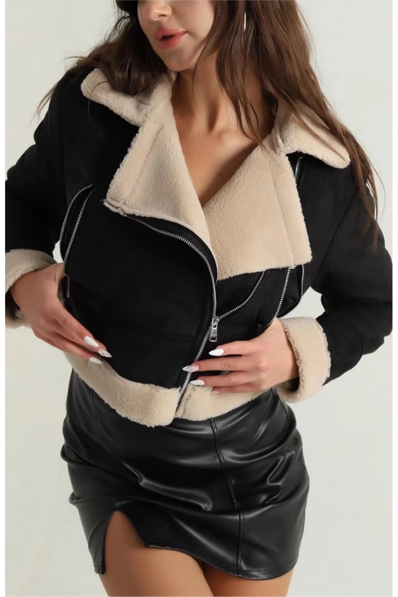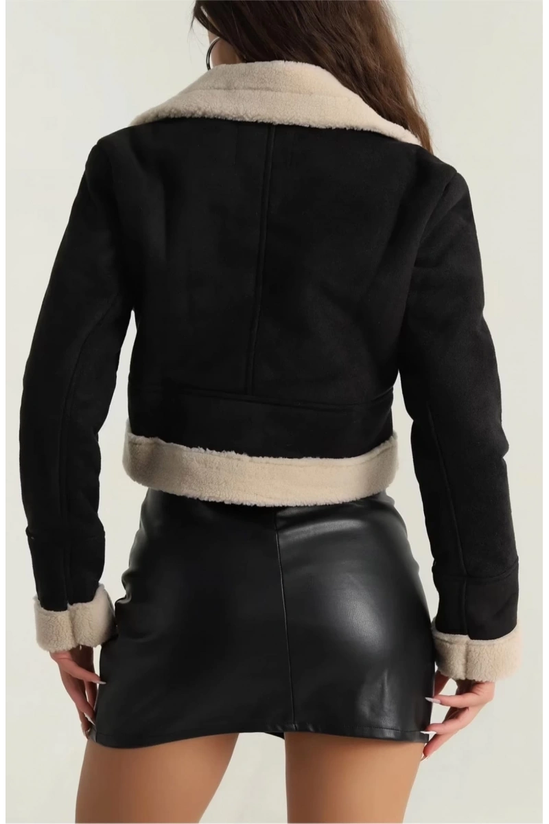 İçi kürklü dışı süet kısa kaban siyah t1186