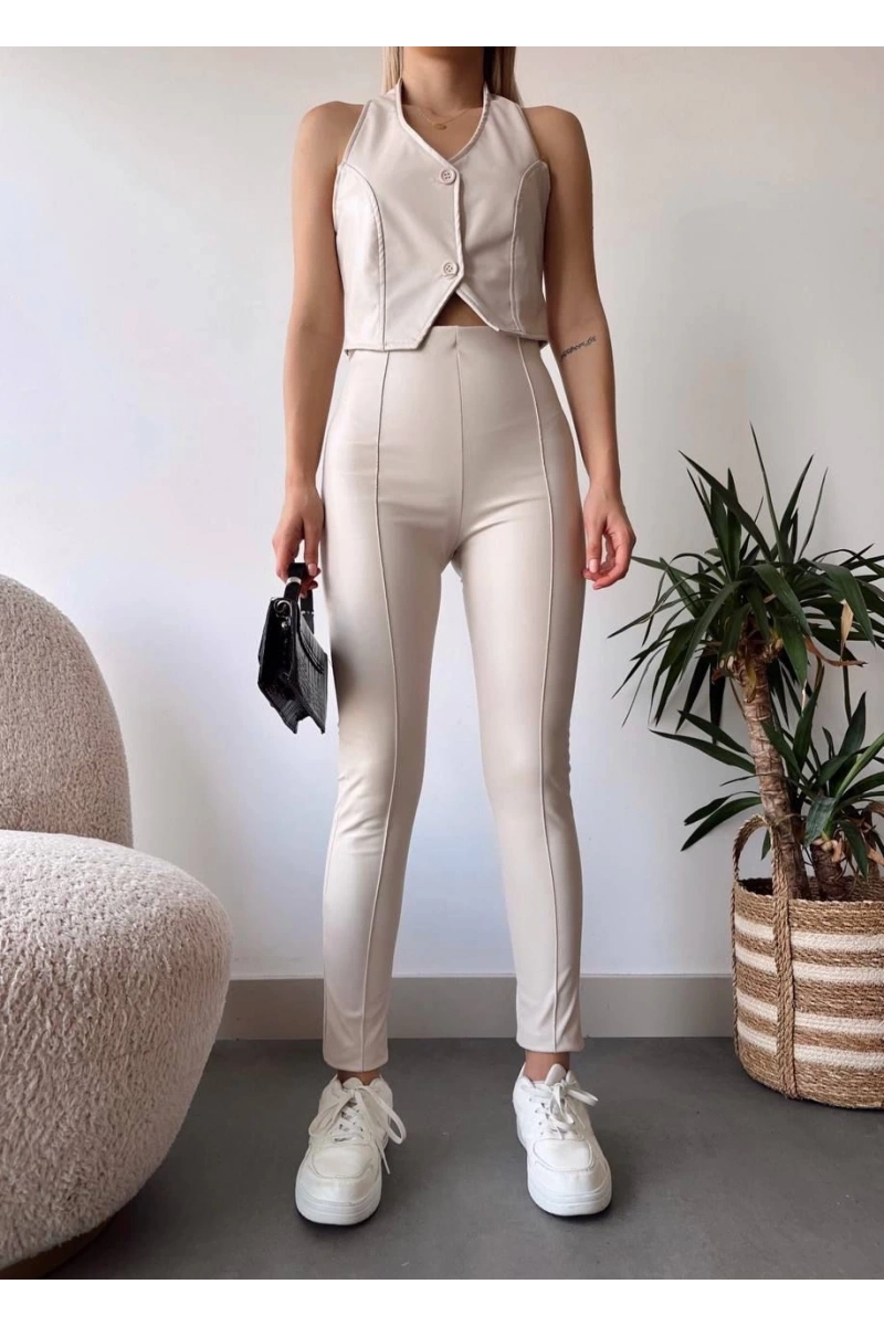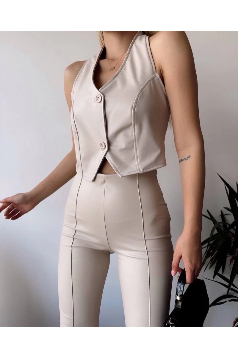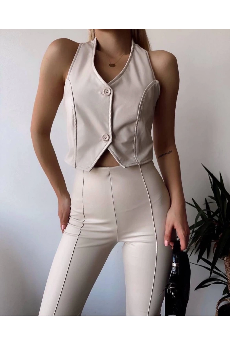 İki düğmeli deri yelek krem s243001, kadın giyim kategorisinde şıklık ve zarafet arayanların tercihi. İşte bu yeleğin özellikleri:
