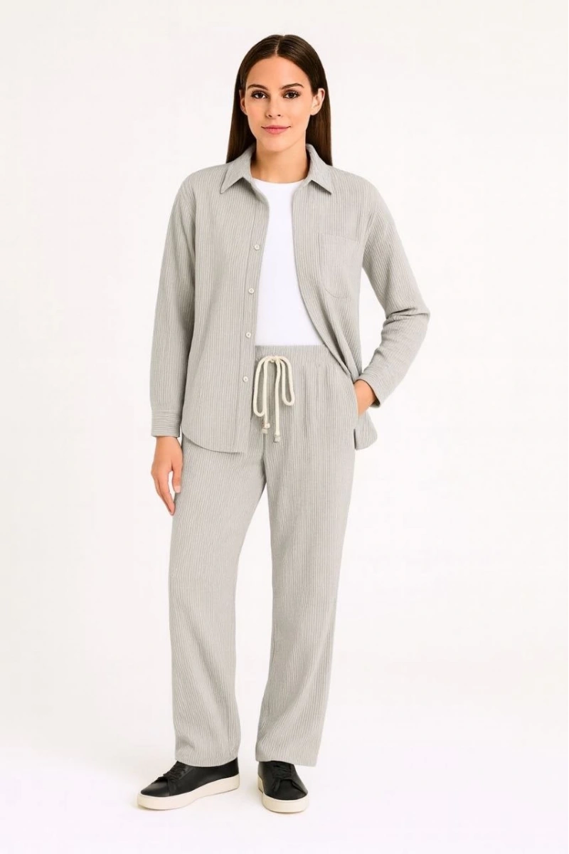 Kadın Kadife Oversize Takım – Gömlek ve Pantolon İkili Set Füme Corduroy Şıklığı, Rahat ve Zarif Duruş Yumuşak Dokulu Kadife Kumaş, Düğmeli Gömlek Üst ve Lastikli Pantolon Alt Parça ile Gün Boyu Konfor- Gri