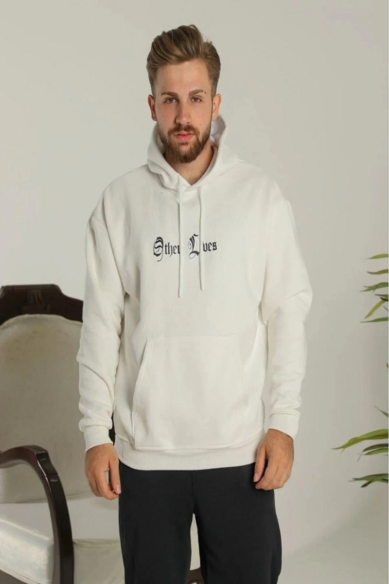 Erkek Oversize Üç İplik Şardonlu Kapüşonlu Sweatshirt – Beyaz “Other Lives” Ön ve Arka Baskılı, Kanguru Cepli, Ribanalı Rahat Kışlık Model Beyaz