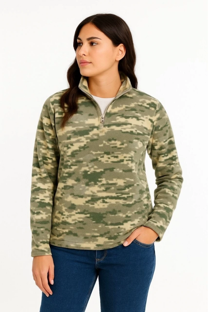 Kadın Yarım Fermuarlı Desenli Polar Sweat – Haki Kamuflaj Yakalı, Uzun Kollu, Oversize Rahat Kalıp - Haki