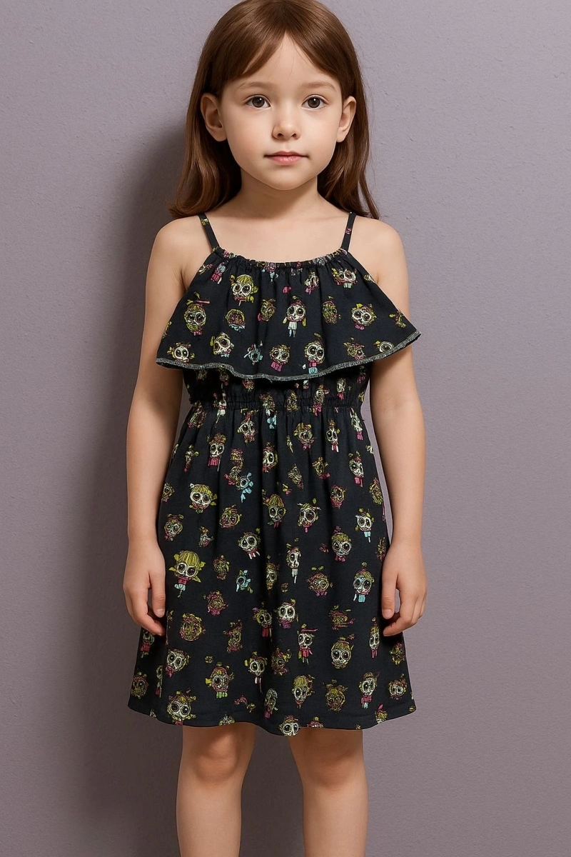 Hayallerindeki kız çocuk elbisesi artık burada! Lacivert rengiyle şıklığı ve zarafeti bir arada sunan Karikatür Baskılı Askılı Kız Çocuk Elbisesi, minik prenseslerin vazgeçilmezi olmaya aday.