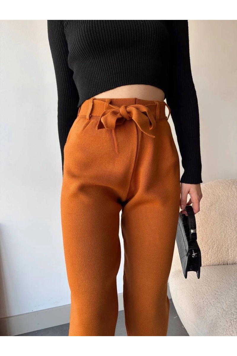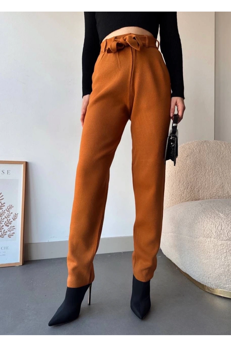 Şıklığı ve rahatlığı bir arada sunan Kendinden Kemerli Triko Pantolon Camel, gardırobunuzun vazgeçilmezi olmaya aday!