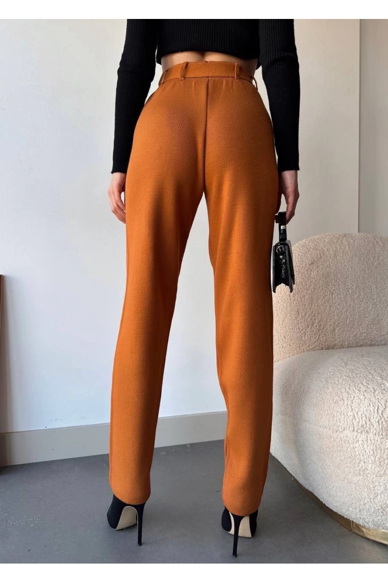 Ofis şıklığında ya da günlük kombinlerde tercih edebileceğiniz Kendinden Kemerli Triko Pantolon Camel, şıklığı ve konforu bir arada arayan kadınların favorisi olacak!