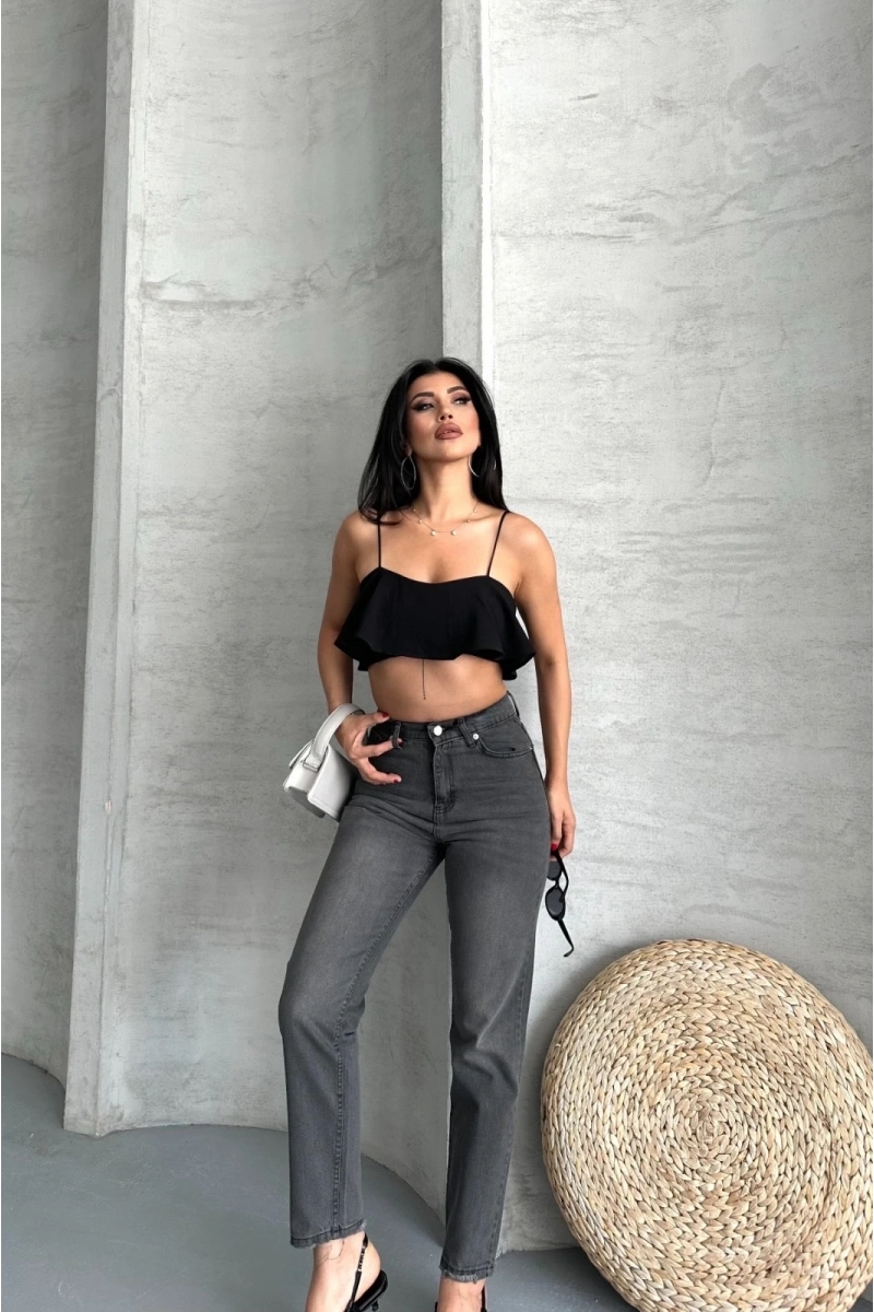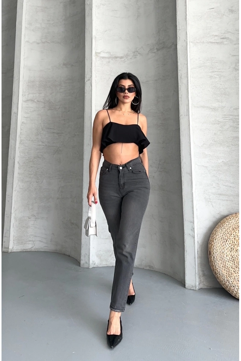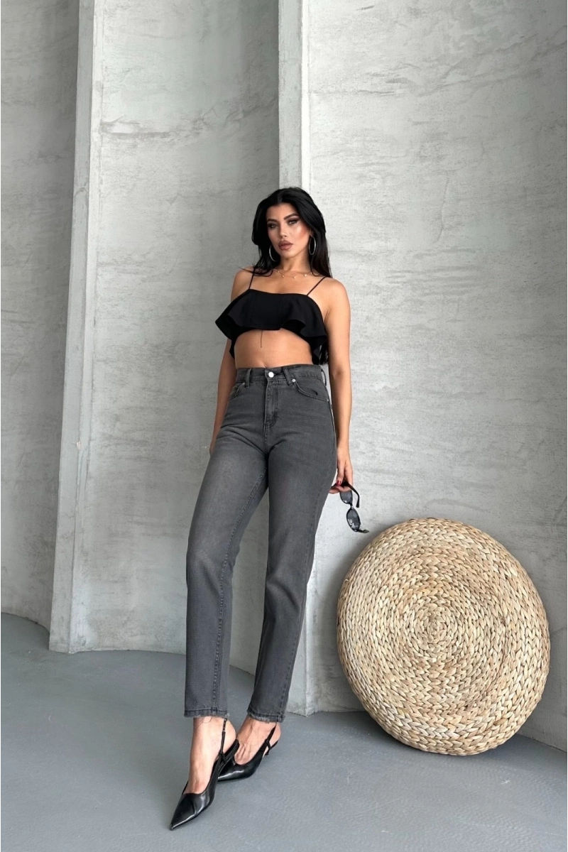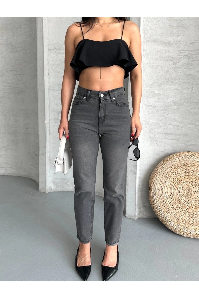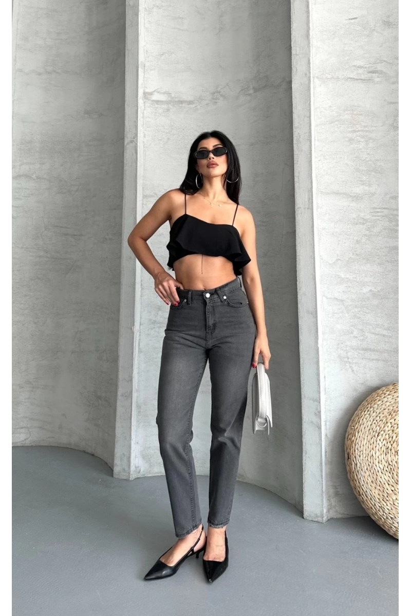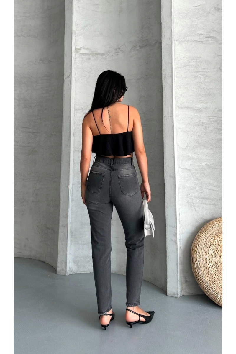 Şıklığı ve konforu bir arada sunan Mom fit enzim taş yıkama jeans pantolon füme rengi ile hem günlük hayatta hem de özel günlerde tarzınızı konuşturabilirsiniz.