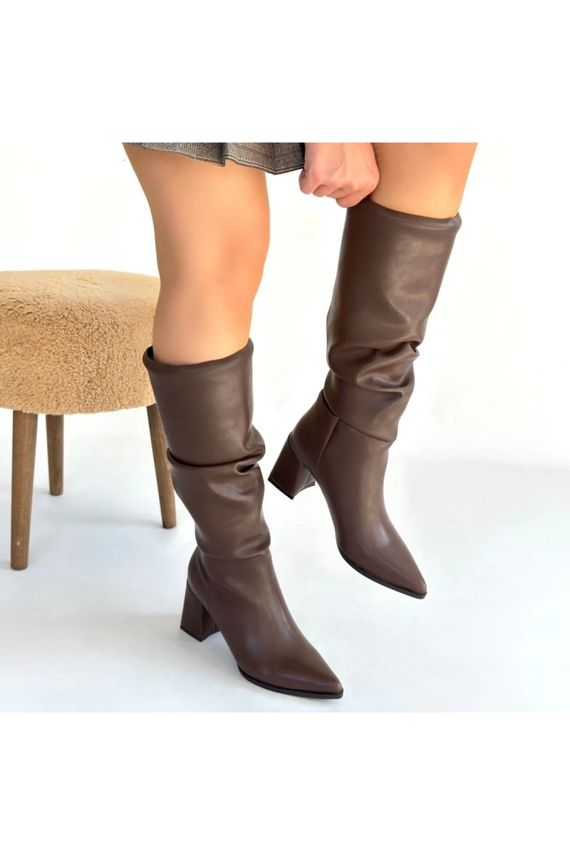 Pitay Kahverengi Cilt Körüklü Topuklu Çizme