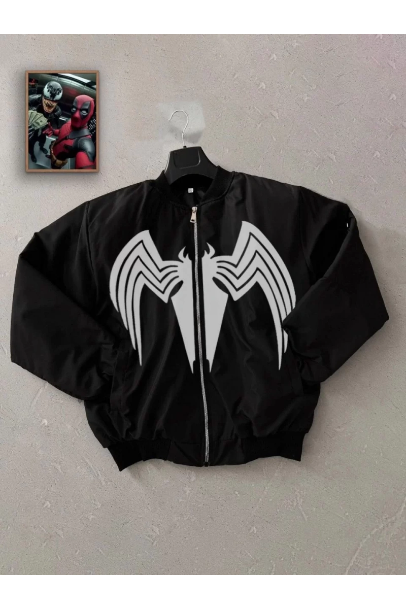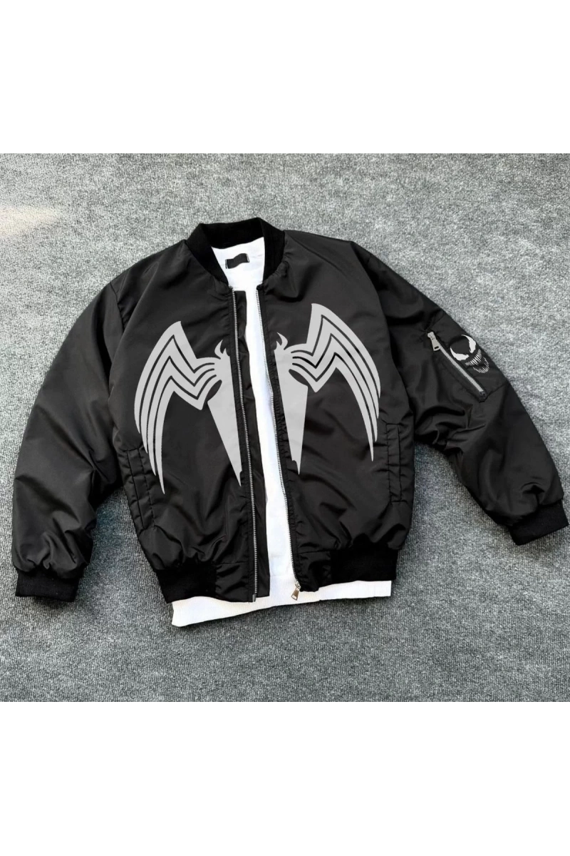 Venom Örümcek Desenli Erkek Mont – Siyah Bomber Ceket, Fermuarlı, Kol Fermuarlı Cep Detaylı, Günlük ve Sokak Modası İçin Uygun - Siyah