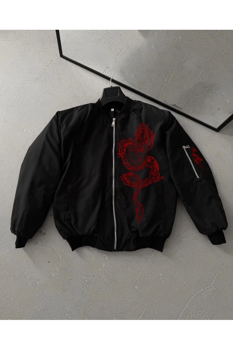 Erkek Unisex Siyah Bomber Mont – Kırmızı Ejderha Desenli, Fermuarlı Cepli, Kapitone Astarlı Günlük ve Sokak Modası Ceket - Siyah