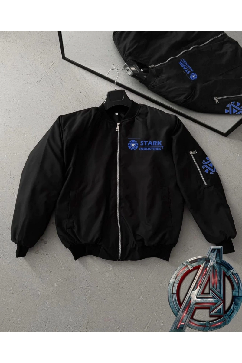 Stark Industries Siyah Bomber Mont – Fermuarlı, Cepli, Uzun Kollu, Kapitone Astarlı, Bahar ve Kış Mevsimi Rahat Unisex Ceket - Siyah