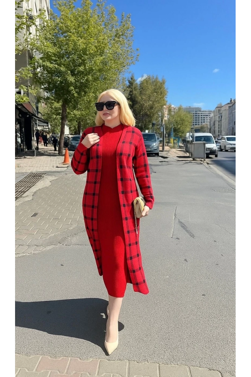 Triko Hırka elbise ikili takım kırmızı, gardırobunuzun vazgeçilmezi olmaya aday!
