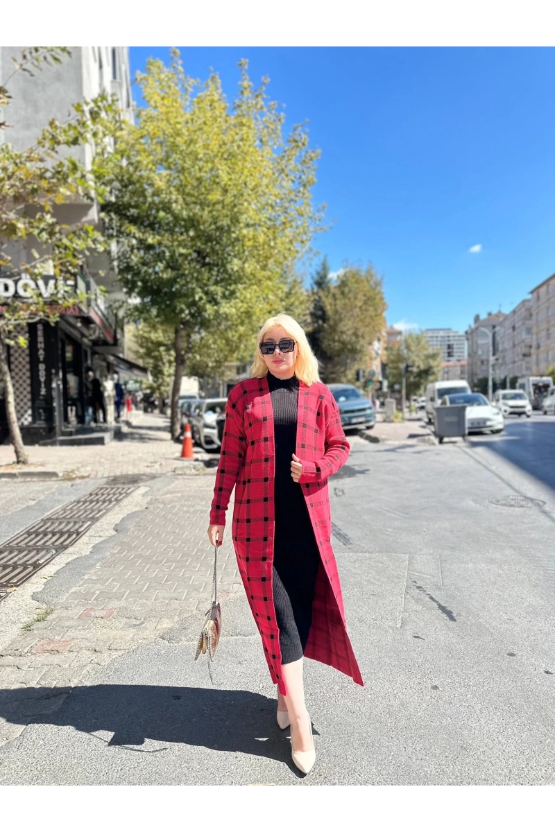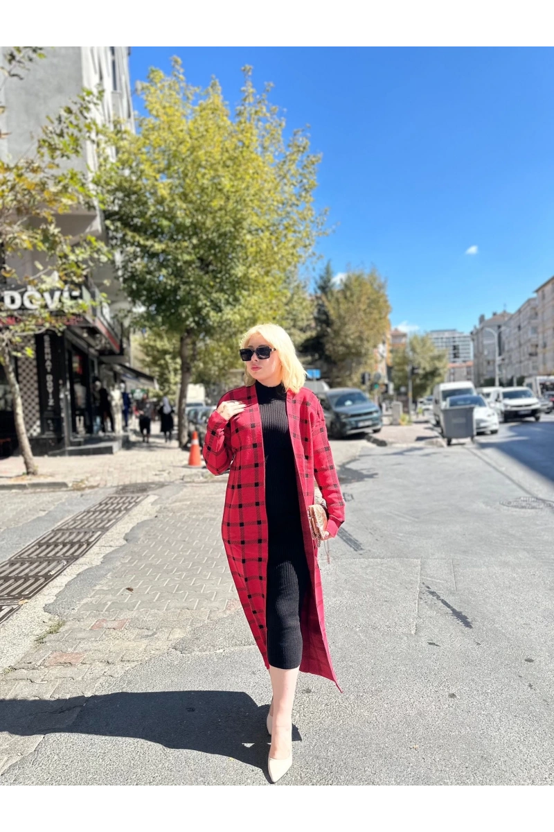 Triko Hırka Elbise İkili Takım, feminen ve şık bir görünüm sunar. KırmızıSiyah renk kombinasyonuyla dikkat çeker.