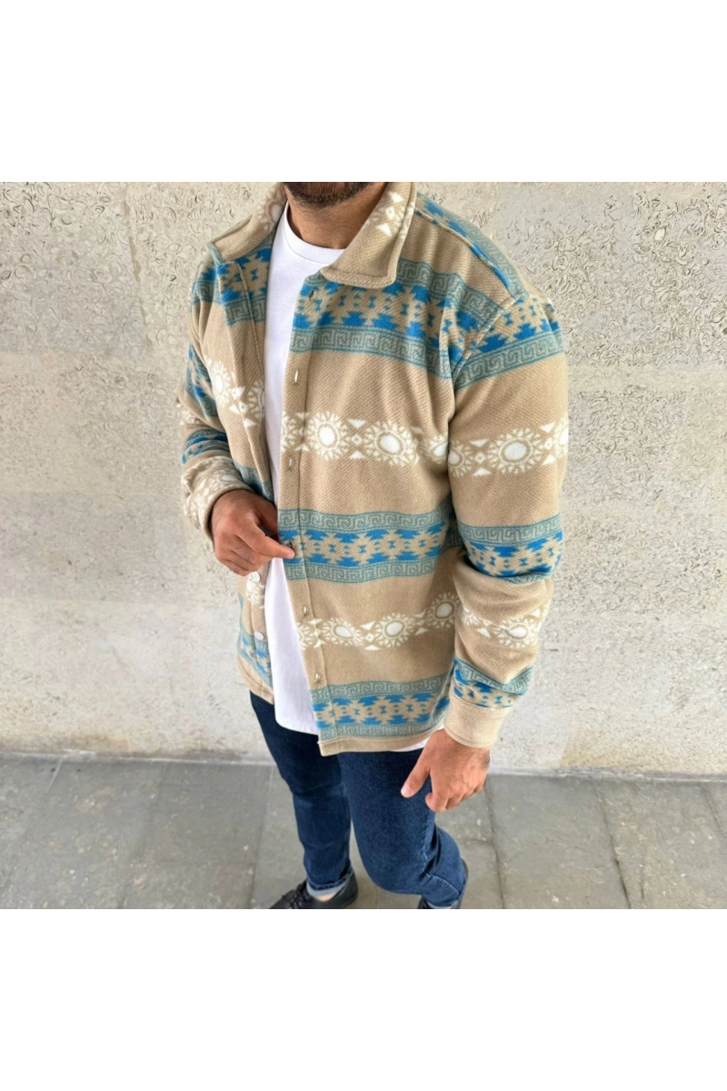 Erkek Desenli Polar Gömlek – Etnik Şerit Desen Yakalı, Uzun Kollu, Düğmeli, Oversize Rahat Kalıp - Sarı