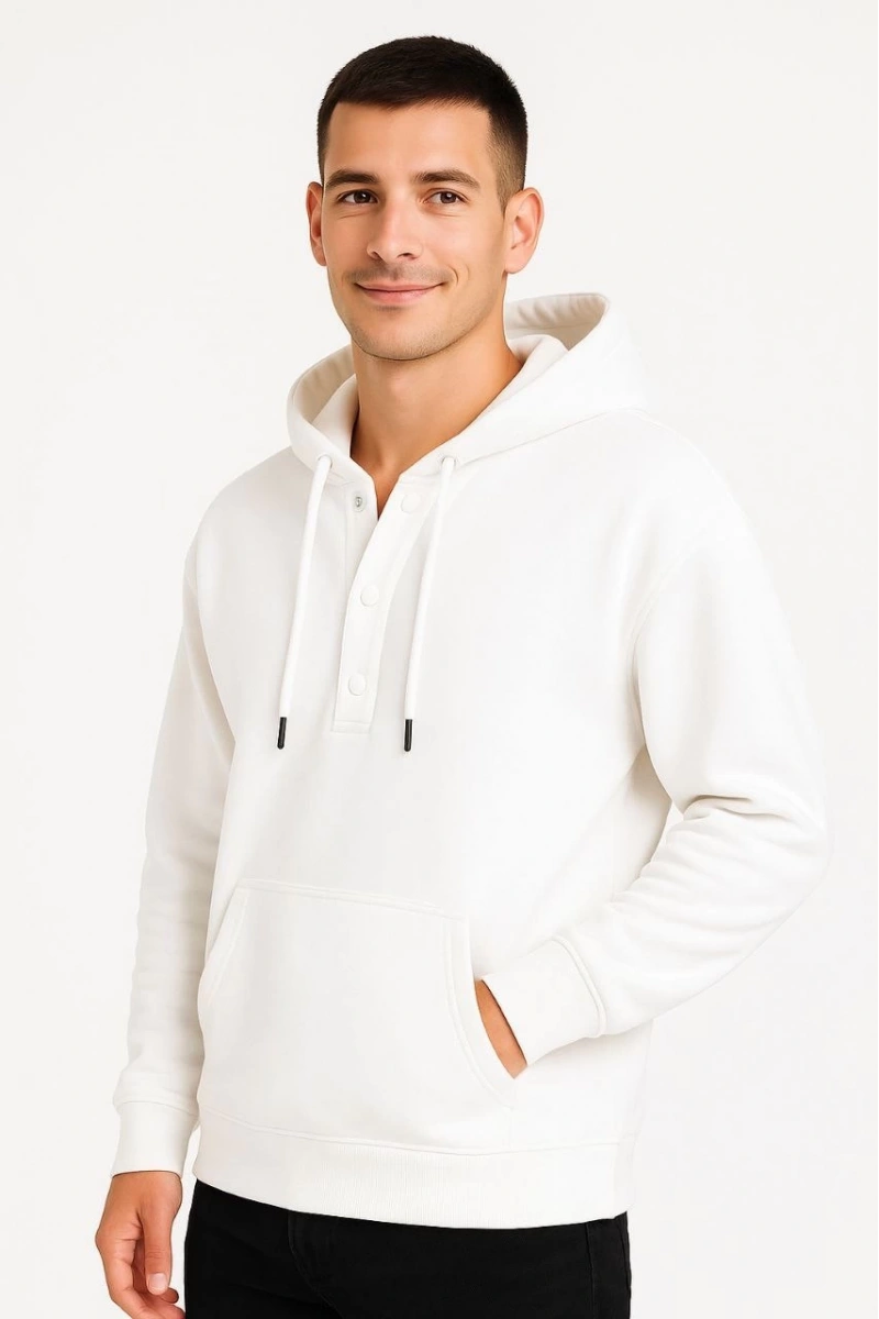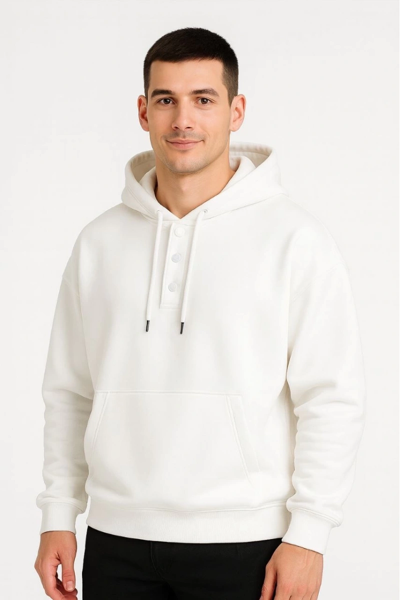 Erkek Ovarsize Kapüşonlu Swetshirt Kanguru Çepli Cıtcıtlı 3 iplik Şardonlu Hoodie - Beyaz