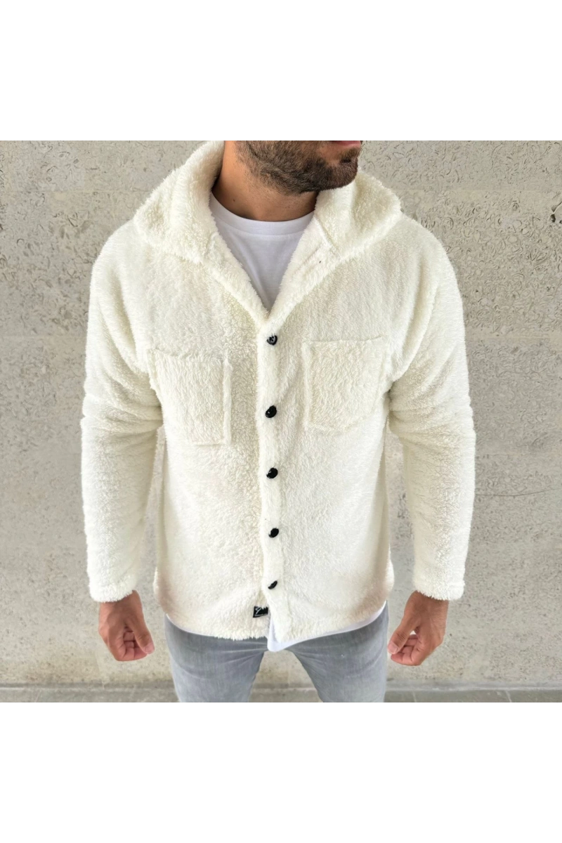 Erkek Pelüş Polar Hırka Gömlek – Yakalı, İlik Düğmeli, Göğüs Cepli, Yumuşak Dokulu Kışlık Regular Fit Rahat Günlük Model - Beyaz