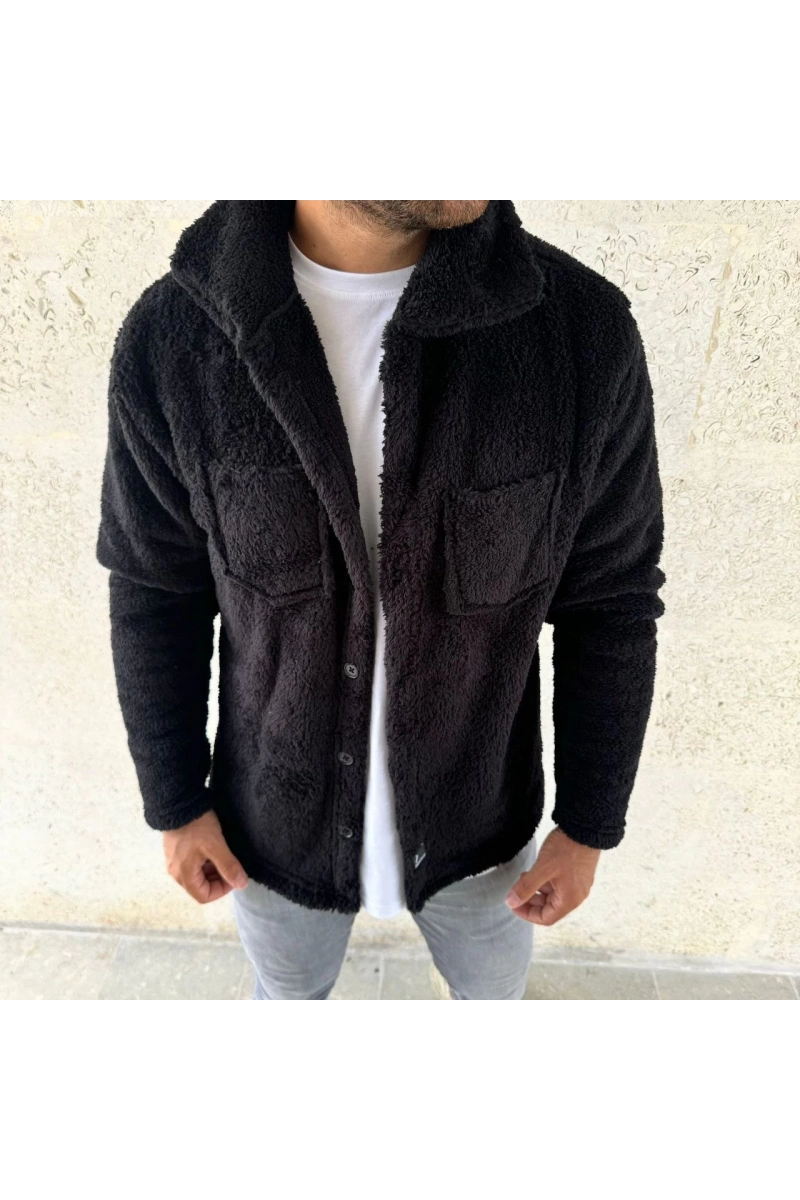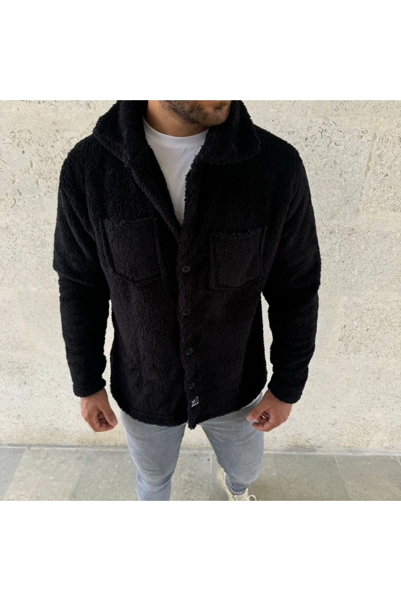 Erkek Pelüş Polar Hırka Gömlek – Yakalı, İlik Düğmeli, Göğüs Cepli, Yumuşak Dokulu Kışlık Regular Fit Rahat Günlük Model - Siyah