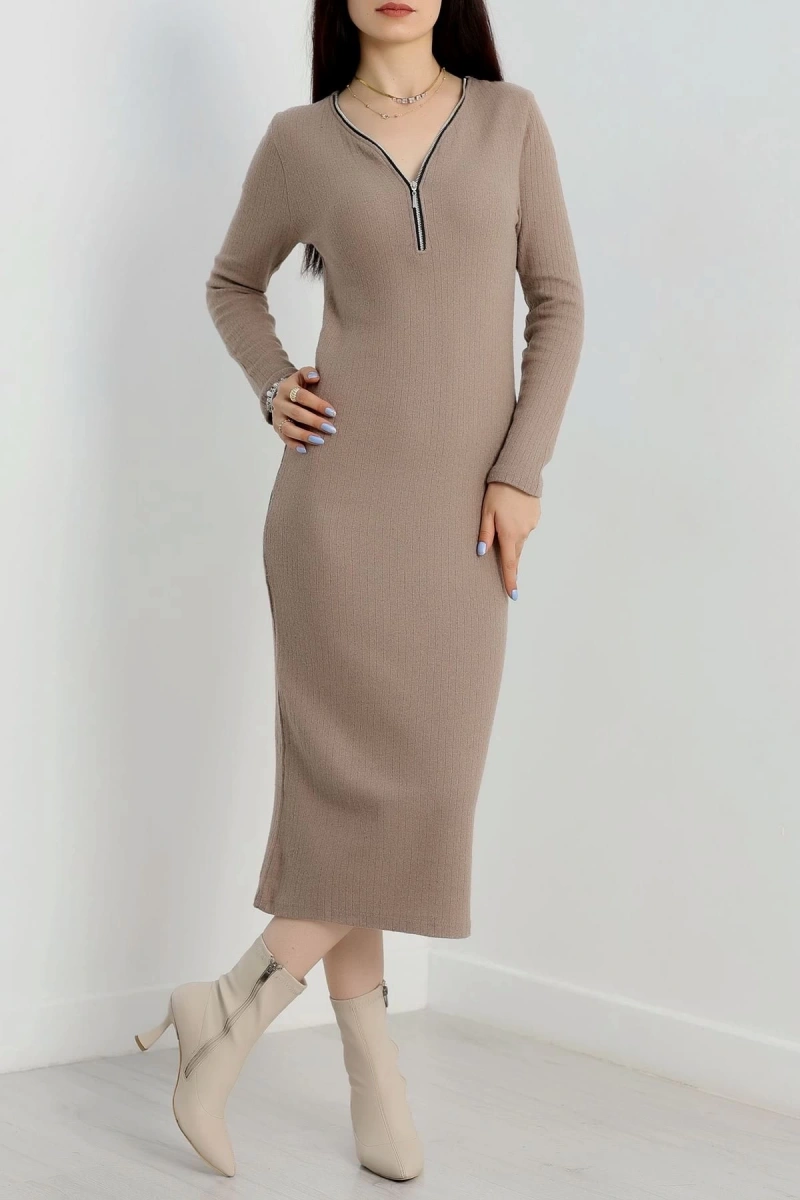 Fermuar detaylı fitilli şardonlu elbise bej a3178