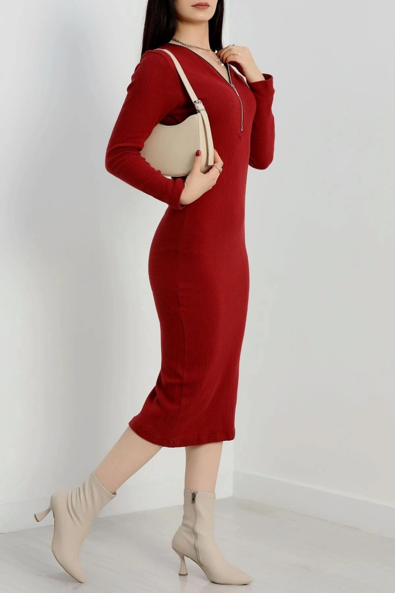 Fermuar detaylı fitilli şardonlu elbise bordo a3178