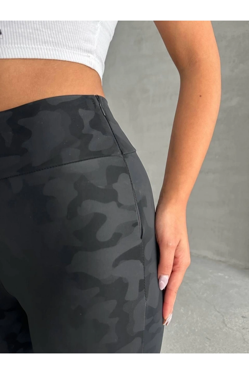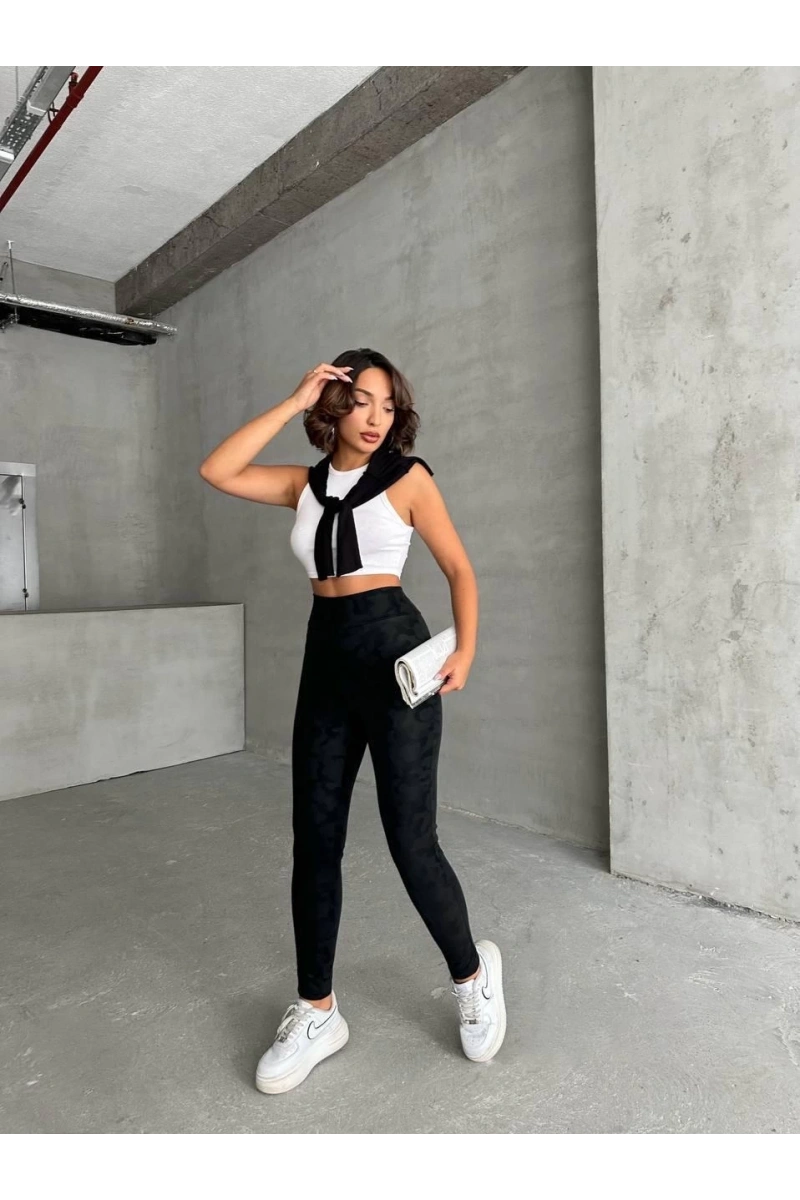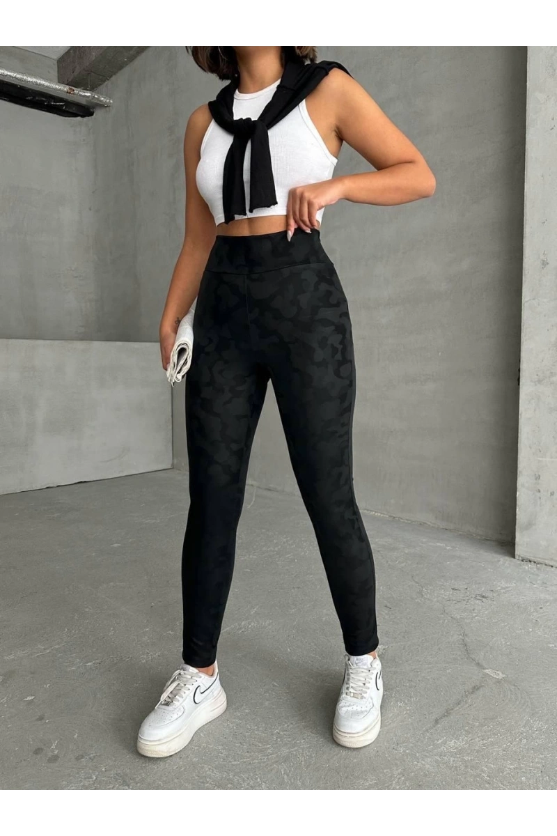 Trendleri takip eden kadınların favorisi olmaya aday, gizli yan fermuarlı bulut desenli siyah tayt ile şıklığı ve rahatlığı bir arada yaşayacaksınız.